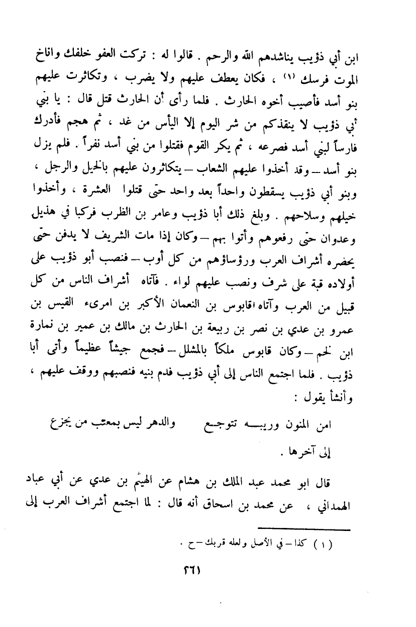 ابن أبي ذؤيب يناشدهم الله والرحم. قالوا له: تركت العفو خلفك وأناخ الموت فرسك، فكان يعطف عليهم ولا يضرب، وتكاثرت عليهم بنو أسد فأصيب أخوه الحارث. فلما رأى أن الحارث قتل قال: يا بني أبي ذؤيب لا ينقذكم من شر اليوم إلا اليأس من غد، ثم هجم فأدرك فارساً لبني أسد فصرعه، ثم يكر القوم فقتلوا من بني أسد نفراً. فلم يزل بنو أسد - وقد أخذوا عليهم الشعاب - يتكاثرون عليهم بالخيل والرجل، وبنو أبي ذؤيب يسقطون واحداً بعد واحد حتى قتلوا العشرة، وأخذوا خليهم وسلاحهم. وبلغ ذلك أبا ذؤيب وعامر بن الظرب فركبا في هذيل وعدوان حتى رفعوهم وأتوا بهم - وكان إذا مات الشريف لا يدفن حتى يحضره أشراف العرب ورؤساؤهم من كل أوب - فنصب أبو ذؤيب على أولاده قبة على شرف ونصب عليهم لواء. فآتاه أشراف الناس من كل قبيل من العرب وىتاه قابوس بن النعمان الأكبر بن امرئ القيس بن عمرو بن عدي بن نصر بن ربيعة بن الحارث بن مالك بن عمير بن نمارة ابن لخم - وكان قابوس ملكاً بالمشلل - فجمع جيشاً عظيماً وأتى أبا ذؤيب. فلما اجتمع الناس إلى أبي ذؤيب فدم بنيه فنصبهم ووقف عليهم، وأنشأ يقول: