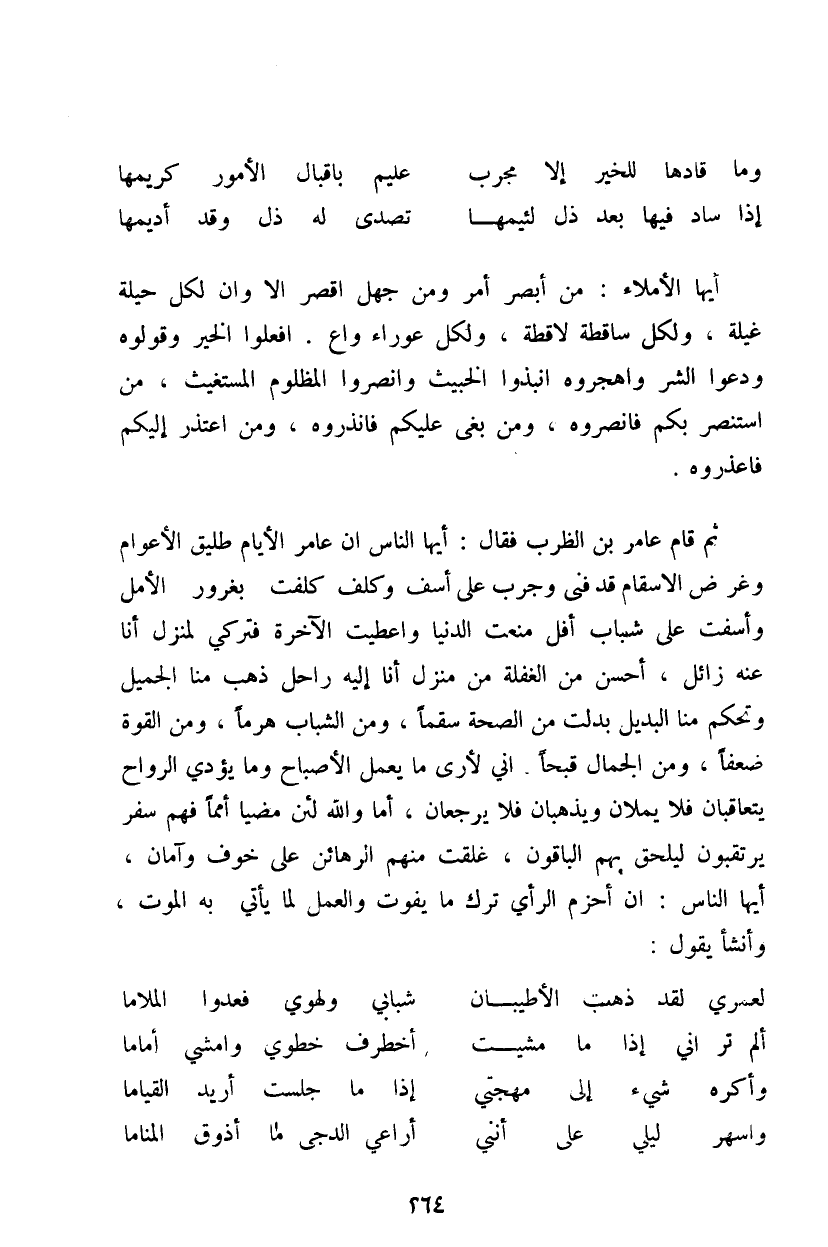 ثم قام عامر بن الظرب فقال: أيها الناس إن عامر الأيام طليق العوام وغرض الأسقام فد فنى وجرب على أسف وكلف كلفت بغرور الأمل وأسفت على شباب أفل منعت الدنيا وأعطيت الآخرة فتركى لمنزل أنا عنه زائل، أحسن من الغفلة من