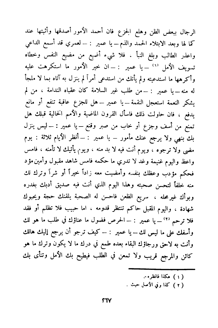 الرجال ببعض الظن وهلع الجزع فإن احمد الأمور أصدقها وأثبتها عند كما لها وبعد الابتلاء الحمد والذم - يا عمير: - لعمري قد أسمع الداعي واعذر الطالب وبلغ النبأ، فلا شيء أضيع من مضيع النفس وخطاه تسويف الأمل - يا عمير: - إن خير الأمور ما استكرهت عليه وأكرهها ما استدعيته ولم يأتك من استدعى أمراً لم ينزل به آتاه بما لا ملجأ له منه - يا عمير: - من طلب غير السلامة كان عقباه الندامة، من لم يشكر النعمة استعجل النقمة يا عمير - هل للجزع عاقبة تنفع أو مانع يدفع، فإن حاولت ذلك فأسال القرون الماضية والأمم الخالية قبلك هل تمنع من أسف وجزع أو خاب من صبر وقنع - يا عمير: - ليس ينزل بك ينهى ولا يرجع عنك مأمور - يا عمير: - أنظر الأيام ثلاثة: يوم مضى ولا ترجوه، ويوم أنت فيه لا بد منه، ويوم يأتيك لا تأمنه، فأمس واعظ واليوم غنيمة وغد لا تدري ما حكمه فأمس شاهد مقبول وأمين مؤد فحكم مؤدب وعظك بنفسه وأمضيت معه زاداً خيراً أو شراً وترك لك منه خلفاً لتحسن صحبته وهذا اليوم الذي أنت فيه صديق أدبك بغدره وبواك غير محله، سريع الظعن فأحسن له الصحبة يلقنك حجة ويحبوك شهادة، واليوم المقبل حاكم تنتظر قدومه، أما حبيب فلا تظلم أو فقد فلا ترحم - يا عمير: - الحرص فضول ما عناؤك في طلب ما هو لك وأسفك على ما ليس لك - يا عمير: - كيف ترجو أن يرجع إليك هالك وأنت به لاحق ورجاؤك البقاء بعده طمع في درك ما لا يكون وترك ما هو