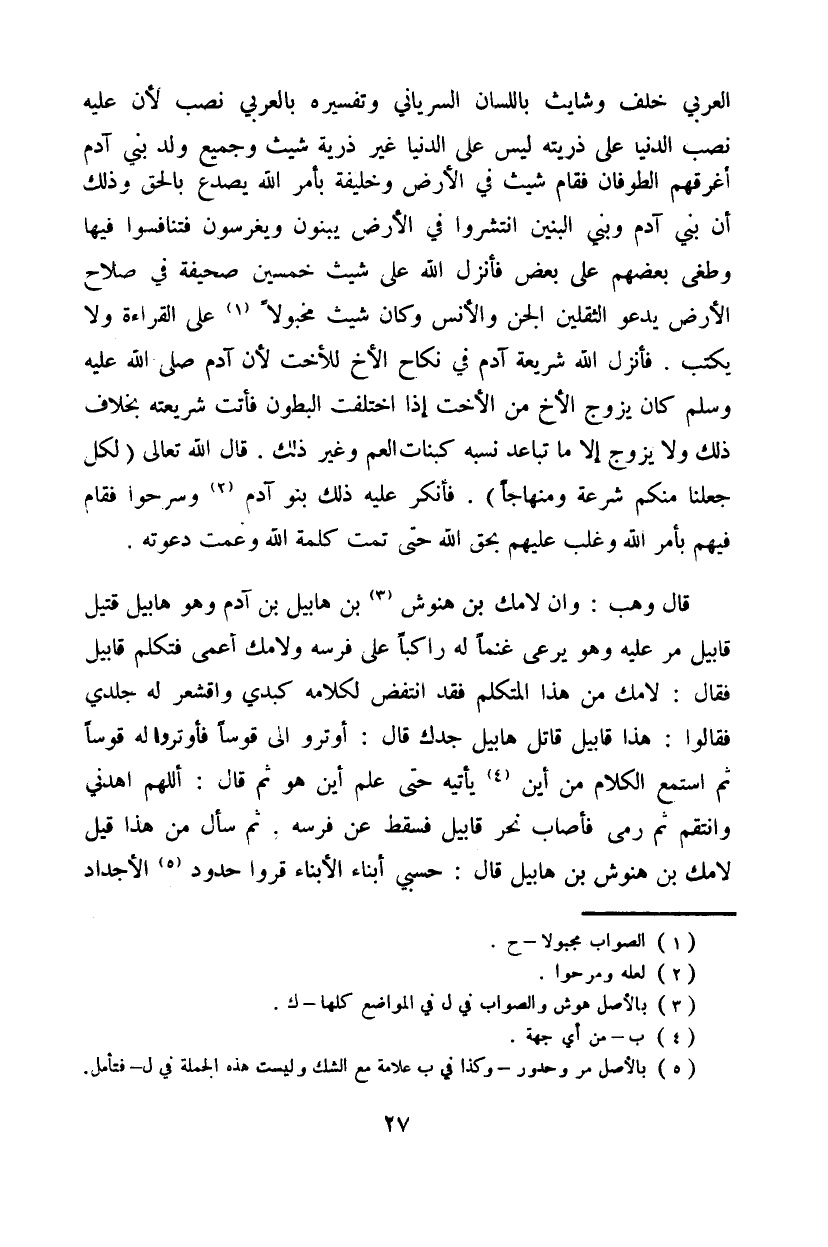 العربي خلف وشايث باللسان السيرياني وتفسيره بالعربي نصب لأن عليه نصب الدنيا على ذريته ليس على الدنيا ذرية شيث وجميع ولد بني آدم أغرقهم الطوفان فقام شيث في الأرض وخليفة بأمر الله يصدع بالحق وذلك أن بني آدم وبني البنين انتشروا في الأرض يبنون ويغرسون فتنافسوا فيها وطغى بعضهم على بعض فأنزل الله على شيث خمسين صحيفة في صلاح الأرض يدعو الثقلين الجن والأنس وكان شيث مخبولاً على القراءة ولا يكتب. فأنزل الله شريعة آدم في نكاح الأخ للأخت لأن آدم صلى الله عليه وسلم كان يزوج الأخ من الأخت إذا اختلفت البطون فأتت شريعته بخلاف ذلك ولا يزوج إلا ما تباعد نسبه كبنات العم وغير ذلك. قال الله تعالى {لكل جعلنا منكم شرعة ومنهاجاً}. فأنكر عليه ذلك بنو آدم وسرجوا فقام فيهم بأمر الله وغلب عليهم الله حتى تمت كلمة الله وعمت دعوته.