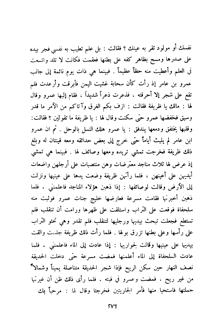 تقر به عينك؟ فقالت: بل علم تطيب به نفسي فجر بيده على صدرها ومسح بظاهر كفه على بطنها فعقمت فكانت لا تلد واتسعت في العلم وأعطيت منه حظاً عظيماً. فبينما هي ذات يوم نائمة إلى جانب عمرو بن عامر غذ رأت كأن سحابة غشيت اليمن فأبرقت وأرعدت فلم تقع على شجر إلا أحرقته، فذعرت ذعراً شديداً، فقام إليها عمرو وقال لها: مالك يا ظريفة فقالت: أزف بكم الغرق وآتاكم من الأمر ما قدر وسبق فخفضها عمرو حتى سكنت وقال لها: يا ظريفة ما تقولين؟ فقالت: وقلبها يختفق ودمعها يندفق: يا عمرو هلك النسل بالوحل. ثم إن عمرو ابن عامر لم يلبث أياماً حتى خرج إلى بعض حدائقه ومعه قينتان وله وبلغ ذلك ظريفة فخرجت تمشي تريده ومعها وصائف لها. فبينما هي تمشي إذ عرض لها ثلاث مناجد معترضات وهن منتصبات على أرجلهن وأضعاف أيديهن على أعينهن، فلما رأتهن ظريفة وضعت يدها على عينيها ونزلت إلى الأرض وقالت لوصائفها: إذا ذهبن هؤلاء المناجد فأعلمني، فلما ذهبن أخبرنها فقامت مسرعة فعارضها خليج جنات عمرو فوثبت منه سلحفاة فوقعت على التراب واستلقت على ظهرها ورامت أن تنقلب فلم تستطع فجعلت تبحث بيديها ورجليها لتنقلب فلم تقدر وعي تحثو التراب على رأسها وعلى بطنها تزرق بولها. فلما رأت ذلك ظريفة جلست والفت بيديها على عينيها وقالت لجواريها: إذا عادت إلى الماء فأعلمنني، فلما عادت السلحفاة إلى الماء أعلمنها فمضت مسرعة حتى دخلت الحديقة نصف النهار حين سكن الريح فإذا شجر الحديقة متناصلة يميناً وشمالاً من غير ريح، فمضت وعمرو في قبته، فلما رأى ذلك ظن أن غيرتها حملتها فاستحيا منها فأمر الجارتين فخرجتا وقال لها: مرجباً بك