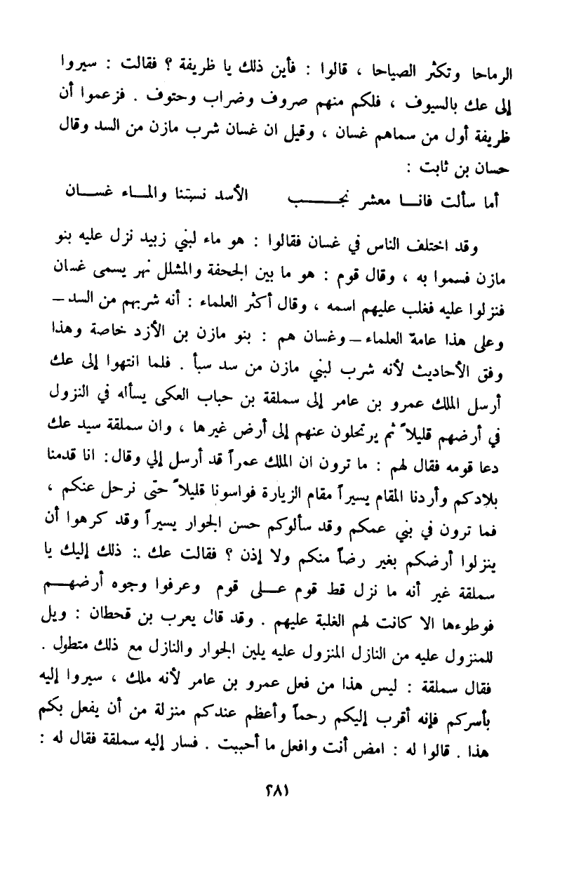 الرماحا وتكثر الصياحا، قالوا: فأين ذلك يا ظريفة؟ فقالت: سيروا إلى عك بالسيوف، فلكم منهم صروف وضراب وحتوف. فزعموا أن ظريفة أول من سماهم غسان، وقيل أن غسان شرب مازن من السد وقال حسان بن ثابت: