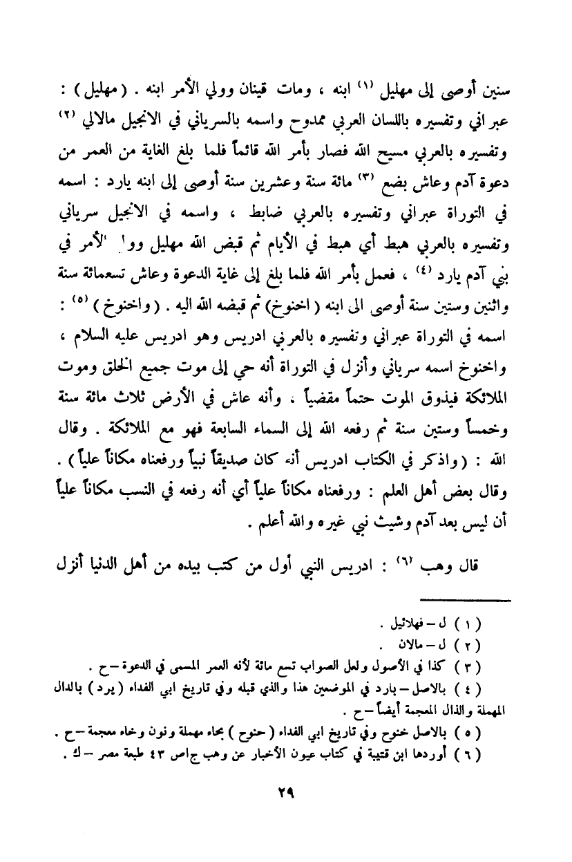 سنين أوصى إلى مهليل ابنه، ومات قينان وولي الأمر ابنه. (مهليل): عبراني وتفسيره باللسان العربي ممدوح واسمه بالسرياني في الإنجيل مالالي وتفسيره بالعربي مسيح الله فصار بأمر الله قائماً فلما بلغ الغاية من العمر من دعوة آدم وعاش بضع مائة سنة وعشرين سنة أوصى إلى ابنه يارد: اسمه في التوراة عبراني وتفسيره بالعربي ضابط، واسمه في الإنجيل سرياني وتفسيره بالعربي هبط أي هبط في الأيام ثم قبض الله مهليل وولي الأمر في بني آدم يارد، فعمل