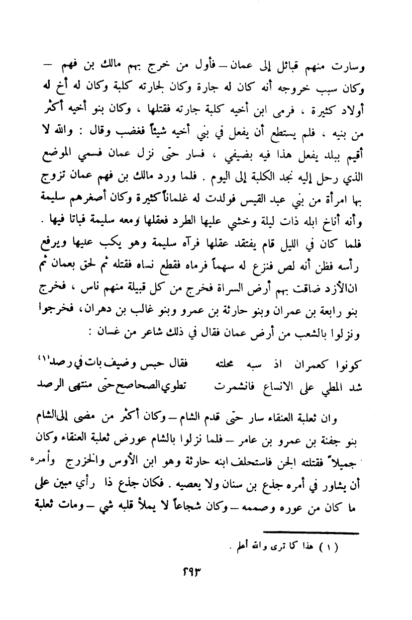 وسارت منهم قبائل إلى عمان - فأول من خرج بهم مالك بن فهم - وكان سبب خروجه إنه كان له جارة