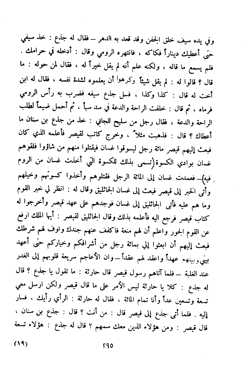 وفي يده سيف خلق الجفن وقد قعد به الدهر - فقال له جذع: خذ سيفي حتى أعطيك ديناراً فكاكه، فانتهزه الرومي وقال: أدخله في حرامك. فلم يسمع ما قاله، ولكنه علم إنه لم يقل خيراً له، فقال لمن حوله: ما قال؟ قالوا له: لم يقل شيئاً وكرهوا أن يعلموه لشدة نفسه، فقال له ابن أخت له قال: كذا وكذا، فسل جذع سيفه فضرب به رأس الرومي فرماه، ثم قال: خلفت الراحة والدعة في سد سبأ، ثم أحمل ضيماً لطلب الراحة والدعة، فقال رجل من سليح للجابي: خذ من جذع بن سنان ما أعطاك؟ قال: فذهبت مثلاً، وخرج كاتب لقيصر فأعلمه الذي كان فبعث إليهم قيصر مائة رجل ليسوقوا غسان فيقتلوا منهم من شاءوا فلقوهم غسان بوادي الكسوة (تسمى