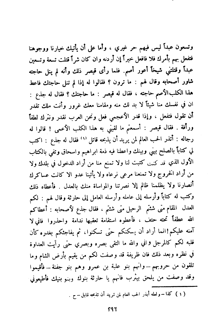 وتسعون عبداً ليس فيهم حر غيري، وأما على أن يأتيك خيارنا ووجوهنا فتفعل بهم بأمرك فلا فافعل خيراً إن أردنه وإن كان شراً قتلت تسعة وتسعين عبداً وقتلتني شيخاً أعور أصم. فلما رأى قيصر ذلك وأنه لم ينل حاجته شاور أصحابه وقال لهم: ما ترون؟ فقالوا له إذا لم تنل حاجتك فأعط هذا الكلب الأصم حاجته، فقال له قيصر: ما حاجتك؟ فقال له جذع: إن في نفسك منا شيئاً لا بد لك منه ومقامنا معك غرور وأنت ملك تقدر أن تقول فتفعل، وإذا قدر الأعجمي فعل ونحن العرب نقدر ونترك لطفاً ورأفة. فقال قيصر: أسمعتم ما لقيني به هذا الكلب الأعمى! قالوا له رجاله: أتذر الحب العالم لمن يريد أن يذبحه قاتل فقال له جذع: اكتب لي كتاباً بالصلح بيني وبينك وأعطنا فيه ذمة إبراهيم وإسحاق وتفي بالكتاب الأول الذي قد كنت كتبت لنا ولا تمنع منا من أراد الدخول في بلدك ولا من أراد الخروج ولا تمنعنا مرعى نرعاه ولا يأتينا
