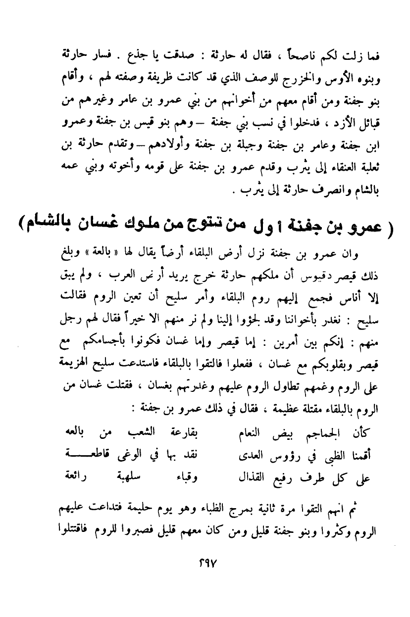 وان عمرو بن جفنة نزل أرض البلقاء أرضاً يقال لها (بالعة) وبلغ ذلك قيصر دقيوس أن ملكهم حارثة خرج يريد أرض العرب، ولم يبق إلا أناس فجمع إليهم روم البلقاء وأمر سليح أن تعين الروم فقالت سليح: نغدر بإخواننا وقد لجئوا إلينا ولم نر منهم إلا خيراً فقال لهم رجل منهم: إنكم بين أمرين: إما قيصر وإما غسان