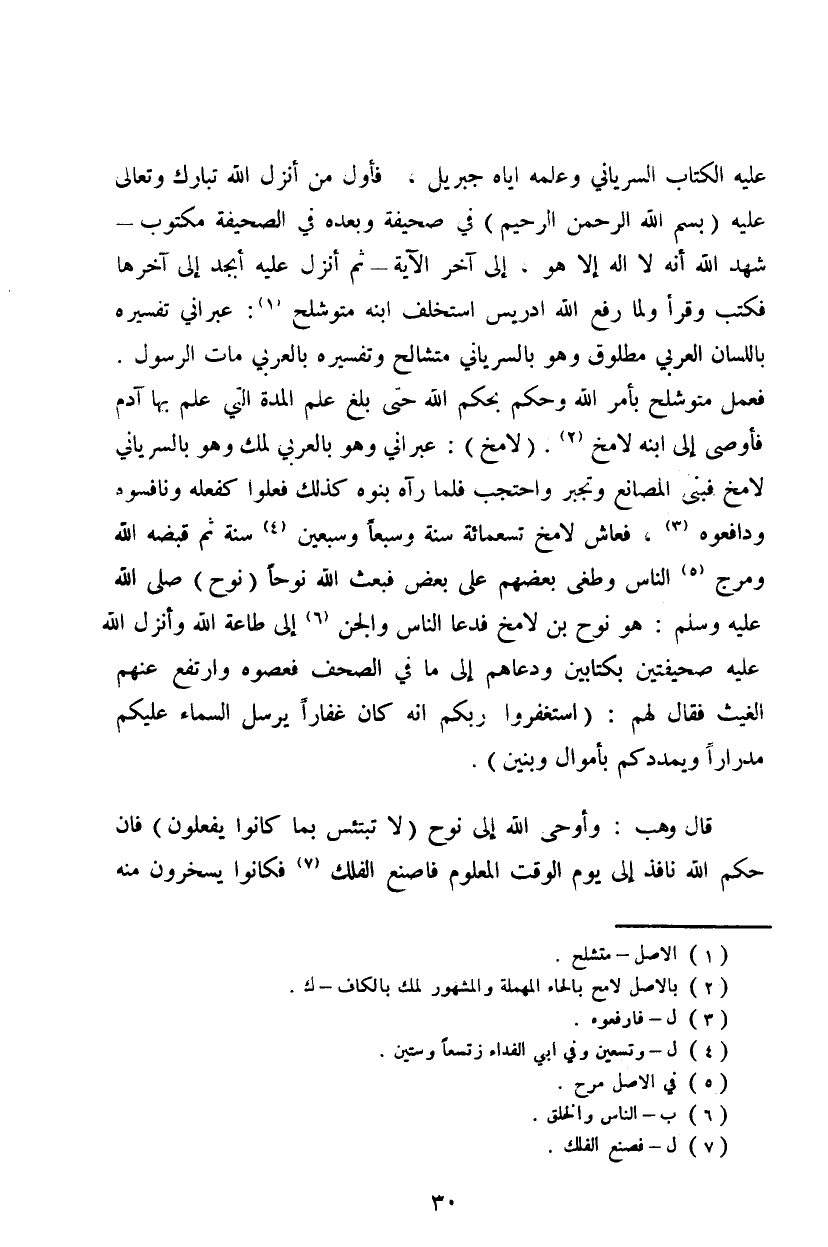 عليه الكتاب السرياني وعلمه إياه جبريل. فأول من أنزل الله تبارك وتعالى عليه {بسم الله الرحمن الرحيم} في صحيفة وبعده في الصحيفة مكتوب شهد الله إنه لا اله إلا هو. إلى آخر الآية ثم أنزل عليه أبجد إلى آخرها فكتب وقرأ ولما رفع الله إدريس استخلف ابنه متوشلح: عبراني تفسيره باللسان العربي مطلوق وهو بالسرياني متشالح وتفسيره بالعربي مات الرسول. فعمل متوشلح بأمر الله وحكم بحكم الله حتى بلغ علم المدة التي علم بها آدم فأوصى إلى ابنه لامخ. (لامخ): عبراني وهو بالعربي لمك وهو بالسرياني لامخ فبنى المصانع وتجبر واحتجب فلما رآه بنوه كذلك فعلوا كفعله ونافسوه ودافعوه، فعاش لامخ تسعمائة سنة وسبعاً وسبعين سنة ثم قبضه الله ومرج الناس وطغى بعضهم على بعض فبعث الله نوحاً (نوح) صلى الله عليه وسلم: هو نوح بن لامخ فدعا الناس والجن إلى طاعة الله وأنزل الله عليه صحيفتين بكتابين ودعاهم إلى ما في الصحف فعصوه وارتفع عنهم الغيث فقال لهم: {استغفروا ربكم إنه كان غفاراً يرسل السماء عليكم مدراراً ويمددكم بأموال وبنين}.