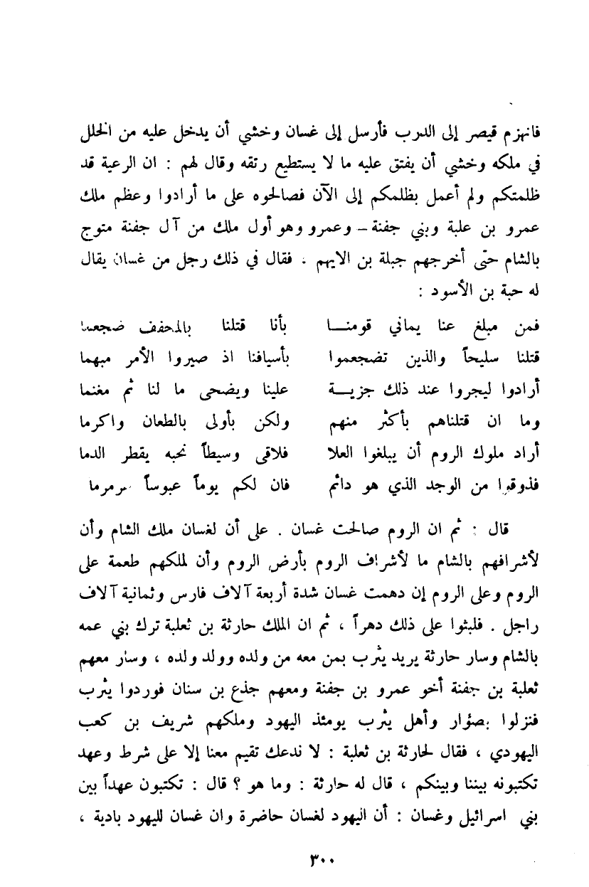 فانهزم قيصر إلى الدرب فأرسل إلى غسان وخشي أن يدخل عليه من الخلل في ملكه وخشي أن يفتق عليه ما لا يستطيع رتقه وقال لهم: إن الرعية قد ظلمتكم ولم أعمل بظلمكم إلى الآن فصالحوه على ما أرادوا وعظم ملك عمرو بن علبة وبني جفنة - وعمرو وهو أول ملك من آل جفنة متوج بالشام حتى أخرجهم جبلة بن الايهم. فقال في ذلك رجل من غسان يقال له حبة بن الأسود: