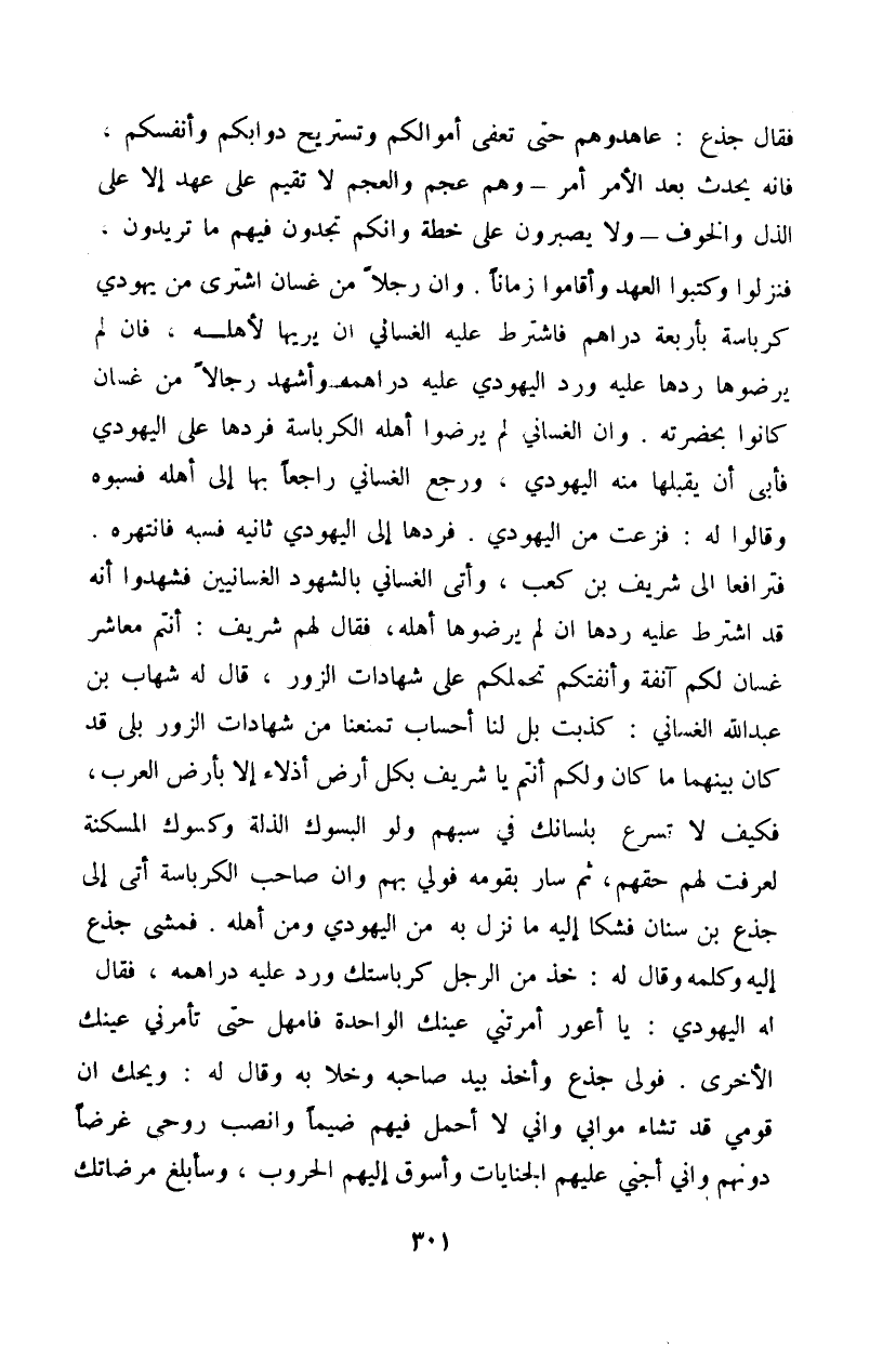 فقال جذع: عاهدوهم حتى تعفى أموالكم وتستريح دوابكم وأنفسكم، فانه يحدث بعد الأمر أمر - وهم عجم والعجم لا تقيم على عهد إلا على الذل والخوف - ولا يصبرون على خطة وإنكم تجدون فيهم ما تريدون، فنزلوا وكتبوا العهد وأقاموا زماناً. وإن رجلاً من غسان اشترى من يهودي كرباسة بأربعة دراهم فاشترط عليه الغساني أن يريها لأهله، فإن لم يرضوها ردها عليه ورد اليهودي عليه دراهمه وأشهد رجالاً من غسان كانوا بحضرته. وإن الغساني لم يرضوا أهله الكرباسة فردها على اليهودي فأبى أن يقبلها منه اليهودي، ورجع الغساني راجعاً بها إلى أهله فسبوه وقالوا له: فزعت من اليهودي. فردها إلى اليهودي ثانية فسبه فانتهره. فترافعا إلى شريف بن كعب، وأتى الغساني بالشهود الغسانيين فشهدوا إنه قد اشترط عليه ردها إن لم يرضوها أهله، فقال لهم شريف: انتم معاشر غسان لكم آنفة وأنفتكم تحملكم على شهادات الزور، قال له شهاب بن عبد الله الغساني: كذبت بل لنا أحساب تمنعنا من شهادات الزور بلى قد كان بينهما ما كان ولكم أنتم يا شريف بكل ارض أذلاء إلا بأرض العرب، فكيف لا تسرع بلسانك في سبهم ولو البسوك الذلة وكسوك المسكنة لعرفت لهم حقهم، ثم سار بقومه فولي بهم وإن صاحب الكرباسة أتى إلى جذع بن سنان فشكا إليه ما نزل به من اليهودي ومن أهله. فمشى جذع إليه وكلمة وقال له: خذ من الرجل كرباستك ورد عليه دراهمه، فقال له اليهودي: يا أعود أمرتني عينك الواحدة فأمهل حتى تأمرني عينك الأخرى. فولى جذع وأخذ بيده صاحبه وخلا به وقال له: ويحك إن قومي قد تشاء موابي واني لا أحمل فيهم ضيماً وانصب روحي غرضاً دونهم واني أجني عليهم الجنايات وأسوق إليهم الحروب، وسأبلغ مرضاتك
