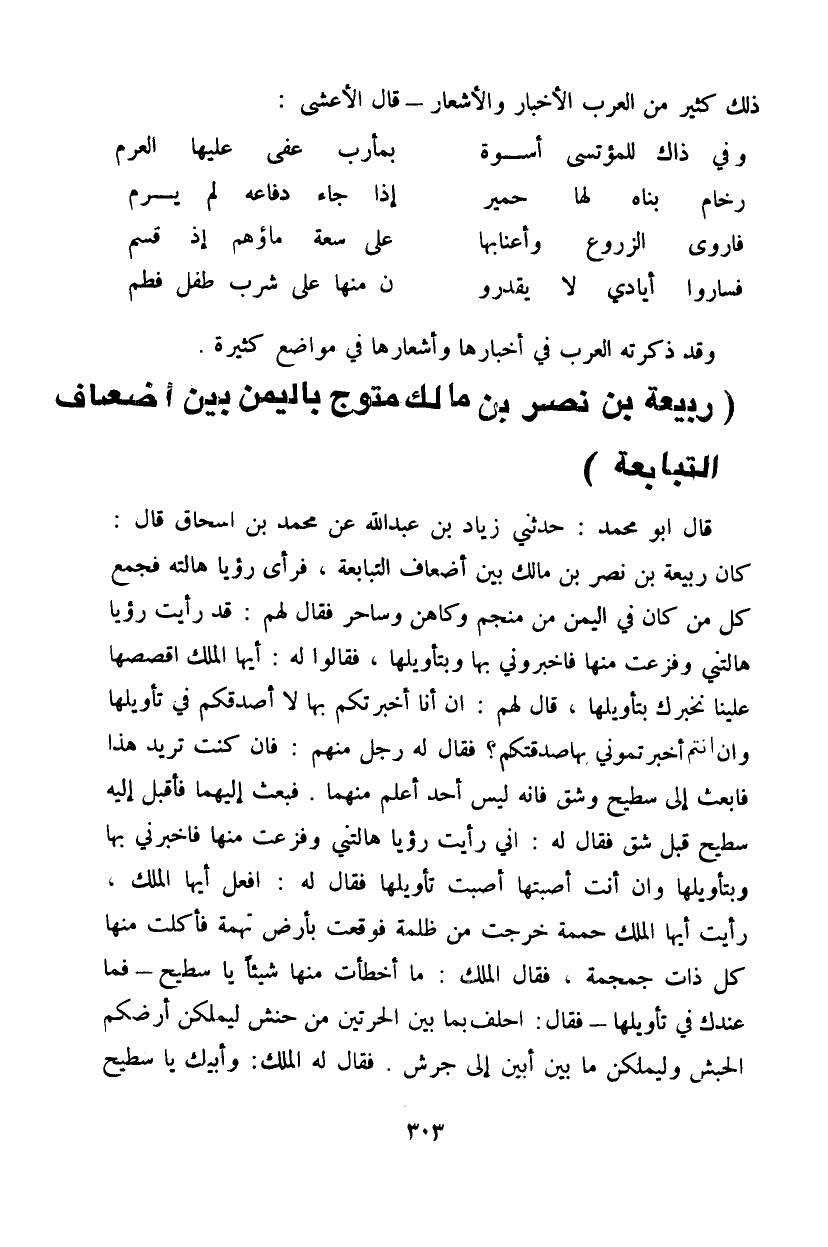 قال أبو محمد: حدثني زياد بن عبد الله عن محمد بن إسحاق قال: كان ربيعة بن نصر بن مالك بين أضعاف التبابعة، فرأى رؤيا هالته فجمع كل من كان في اليمن من منجم وكاهن وساحر فقال لهم: قد رأيت رؤيا هالتني وفزعت منها فاخبروني بها وبتأويلها، فقالوا له: أيها الملك اقصصها علينا نخبرك بتأويلها، قال لهم: ان أخبرتكم بها لا أصدقكم في تأويلها وإن انتم أخبرتموني بها صدقتكم؟ فقال له رجل منهم: فإن كنت تريد هذا فابعث إلى سطيح وشق فانه ليس أحد أعلم منهما. فبعث إليهما فاقبل إليه سطيح قبل شق فقال له: اني رأيت رؤيا هالتني وفزعت منها فاخبرني بها وبتأويلها وإن أنت أصبتها أصبت تأويلها فقال له: افعل أيها الملك، رأيت أيها الملك حممة خرجت من ظلمة فوقعت بأرض تهمة فأكلت منها كل ذات جمجمة، فقال الملك: ما أخطأت منها شيئاً يا سطيح - فما عندك في تأويلها - فقال: احلف بما بين الحرتين من حنش ليملكن أرضكم الحبش وليملكن ما بين أبين إلى جرش. فقال له الملك: وأبيك يا سطيح