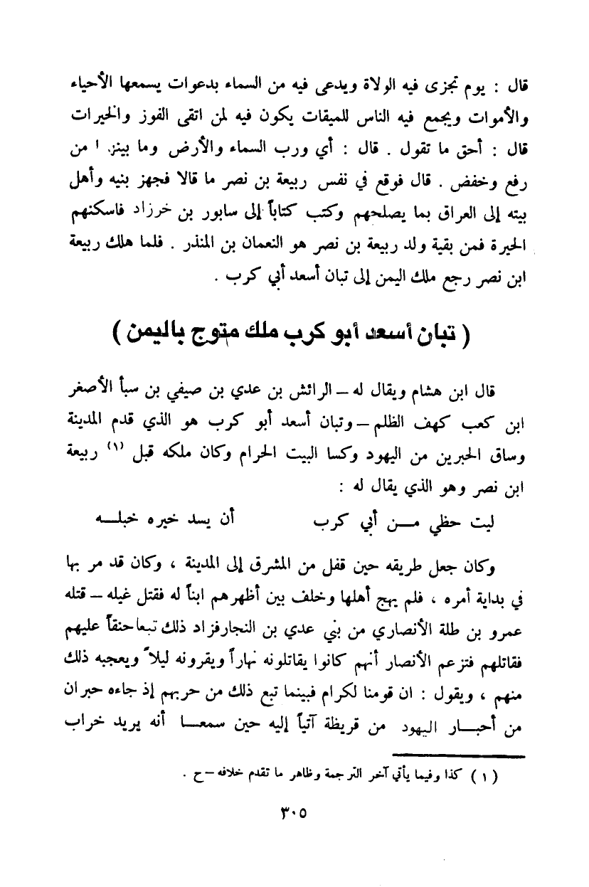 قال ابن هشام ويقال له - الرائش بن عدي بن صيفي بن سبأ الأصغر ابن كعب كهف الظلم - وتبان أسعد أبو كرب هو الذي قدم المدينة وساق الحبرين من اليهود وكسا البيت الحرام وكان ملكه قبل ربيعة ابن نصر وهو الذي يقال له: