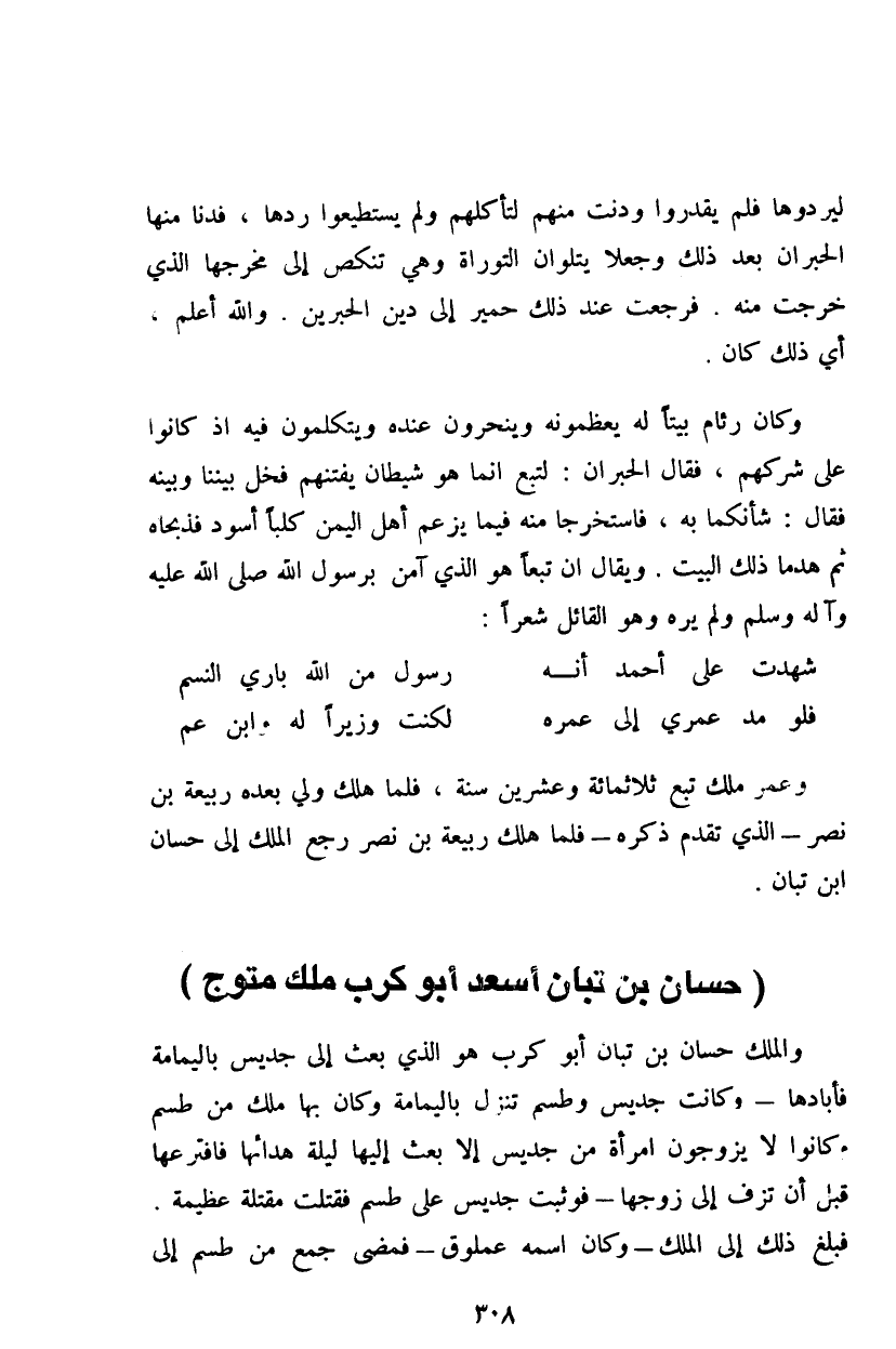 والملك حسان بن تبان أبو كرب هو الذي بعث إلى جديس باليمامة فأبادها - وكانت جديس وطسم تنزل باليمامة وكان بها ملك من طسم وكانوا لا يزوجون امرأة من جديس إلا بعث إليها ليلة هدائها فافترعها قبل أن تزف إلى زوجها -