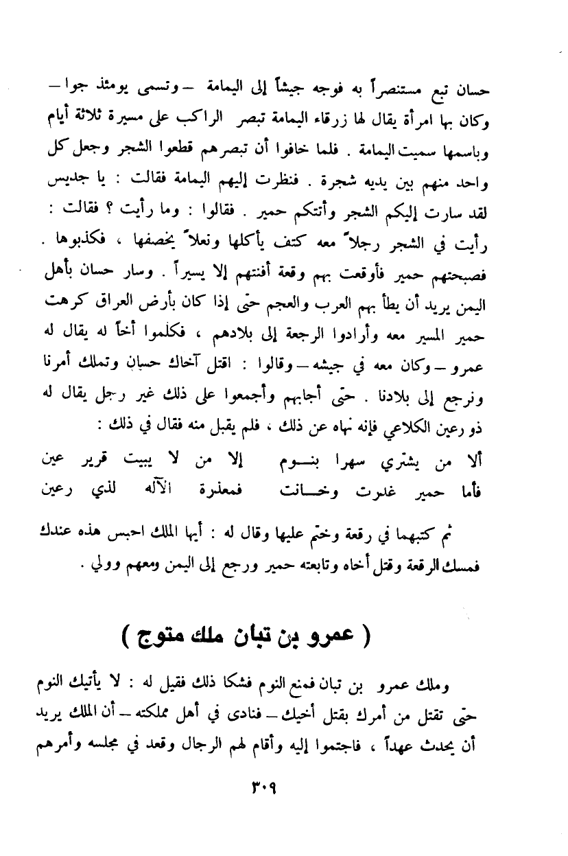 وملك عمرو بن تبان فمنع النوم فشكا ذلك فقيل له: لا يأتيك النوم حتى تقتل من أمرك بقتل أخيك - فنادى في أهل مملكته - أن الملك يريد أن يحدث عهداً، فاجتمعوا إليه وأقام لهم الرجال وقعد في مجلسه وأمرهم