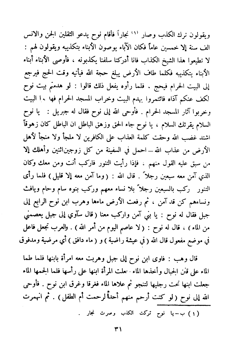 ويقولون ترك الكذب وصار نجاراً فأقام نوح يدعو الثقلين الجن والإنس ألف سنة إلا خمسين عاماً فكان الآباء يوصون الأبناء بتكذيبه ويقولون لهم: لا تطيعوا هذا الشيخ الكذاب فانا أدركنا سلفنا يكذبونه، فأوصى الأبناء أبناء الأبناء بتكذيبه فكلما طاف الأرض يبلغ حجة الله فيأتيه وقت الحج فيرجع إلى البيت الحرام فيحج. فلما رأوه يفعل ذلك قالوا: لو هدمتم بيت نوح لكف عنكم فائتمروا بهدم البيت وخراب المسجد الحرام فهدموا البيت وخربوا آثار المسجد الحرام. فأوحى الله إلى نوح فقال له جبريل: يا نوح السلام يقرئك السلام، يا نوح جاء الحق وزهق الباطل إن الباطل كان زهوقا اشتد غضب الله وحقت كلمة العذاب على الكافرين لا ملجأ ولا منجا لأهل الأرض من عذاب ابنه احمل في السفينة من كل زوجين اثنين وأهلك إلا من سبق عليه القول منهم، فإذا رأيت التنور فاركب أنت ومن معك وكان الذي آمن معه سبعين رجلا. قال الله: {وما آمن معه إلا قليل} فلما رأى التنور ركب بالسبعين رجلاً بلا نساء معهم وركب بنوه سام وحام ويافث ونساءهم كن قد آمن، ثم رفعت الأرض ماءها وهرب ابن نوح الرابع إلى جبل فقال له نوح: يا بني آمن واركب معنا {قال سآوي إلى جبل يعصمني من الماء}، قال له نوح: {لا عاصم اليوم من أمر الله}. والعرب تجعل فاعل في موضع مفعول قال الله {في عيشة راضية} و {ماء دافق} أي مرضية ومدفوق.