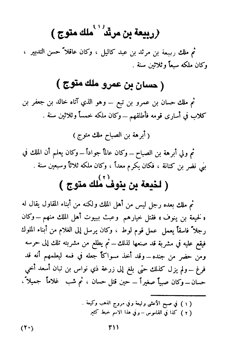 ثم ملك بعده رجل ليس من أهل الملك ولكنه من أبناء المقاول يقال له (لخيعة بن ينوف) فقتل خيارهم وعبث ببيوت أهل الملك منهم - وكان رجلاً فاسقاً يعمل عمل قوم لوط، وكان يرسل إلى الغلام من ابناء الملوك فيقع عليه في مشربة قد صنعها لذلك - ثم يطلع من مشربته تلك إلى حرسه ومن حضر من جنده - وقد أخذ مسواكاً جعله في فمه ليعلمهم إنه قد فرغ - ولم يزل كذلك حتى بلغ إلى زرعه ذي نواس بن تبان أسعد أخي حسان - وكان صبياً صغيراً - حين قتل حسان، ثم شب غلاماً جميلاً،