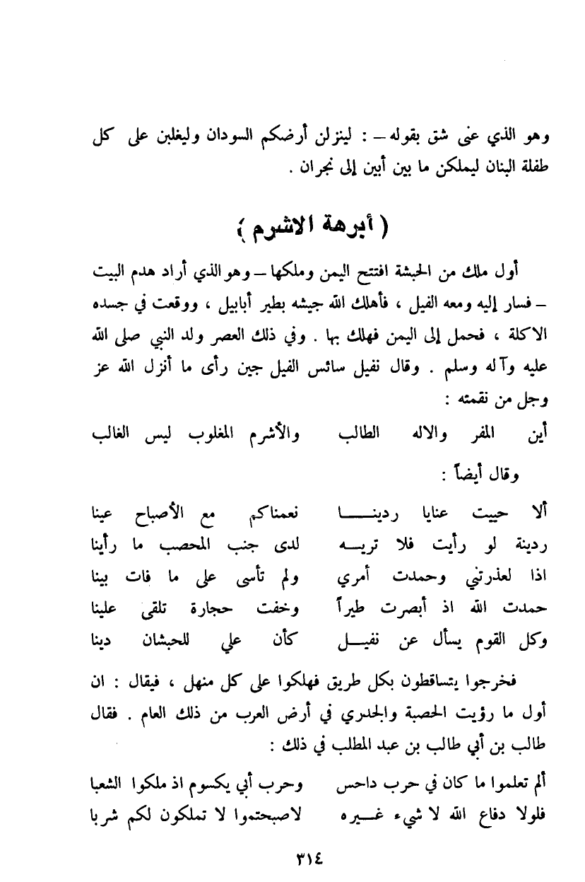 أول ملك من الحبشة افتتح اليمن وملكها - وهو الذي أراد هدم البيت - فسار إليه ومعه الفيل، فأهلك الله جيشه بطير أبابيل، ووقعت في جسده الآكلة، فحمل إلى اليمن فهلك بها. وفي ذلك العصر ولد النبي صلى الله عليه وآله وسلم. وقال نفيل سائس الفيل حين رأى ما أنزل الله عز وجل من نقمته: