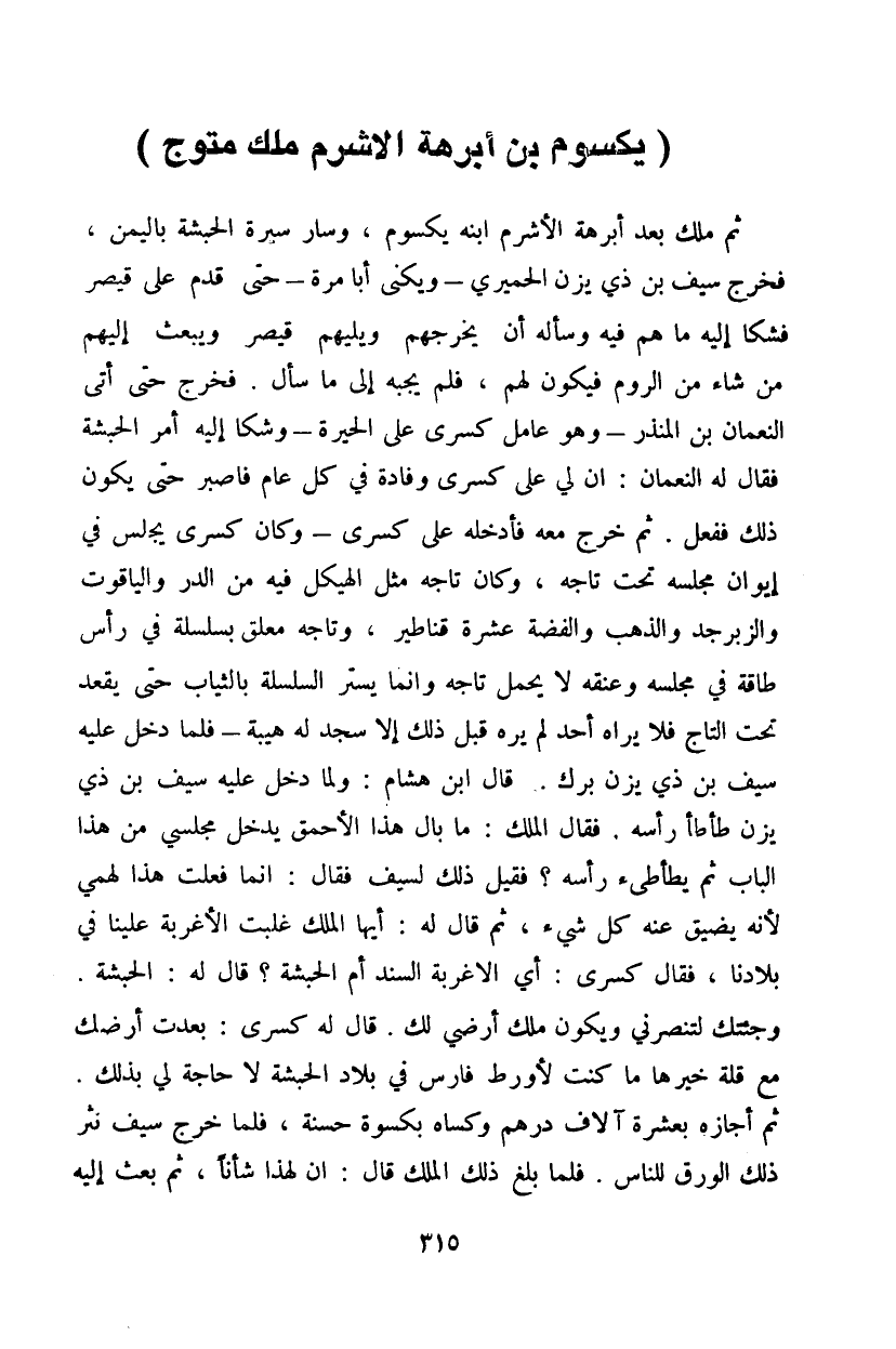 ثم ملك بعد ابرهة الاشرم ابننه يكسوم، سار سيرة الحبشة باليمن، فخرج سيف بن ذي يزن الحميري - ويكنى أبا مرة - حتى قدم على قصير فشكا إليه ما هم فيه وسأله أن يخرجهم ويليهم قيصر ويبعث إليهم من شاء من الروم فيكون لهم، فلم يجبه إلى ما سأل. فخرج حتى أتى النعمان بن المنذر - وهو عامل كسرى على الحيرة - وشا إليه أمر الحبشة فقال له النعمان: أن لي على كسرى وفادة فيكل عام فاصبر حتى يكون ذلك ففعل. ثم خرج معه فأدخله على كسرى - وكان كسرى يجلس في إيوان مجلسه تحت تاجه، وكان تاجه مثل الهيكل فيه من الدر والياقوت والزبرجد والذهب والفضة عشرة قناطير، وتاجه معلق بسلسلة في رأس طاقة في مجلسه وعنقه ولا يحمل تاجه وإنما يستر السلسلة بالثياب حتى يقعد تحت التاج فلا يراه أحد لم يره قبل ذلك إلا سجد له هيبة - فلما دخل عليه سيف بن ذي يزن برك. قال ابن هشام: ولما دخل عليه سيف بن ذي يزن طأطأ رأسه. فقال الملك: ما بال هذا الأحمق يدخل مجلسي من هذا الباب ثم يطأطئ رأسه؟ فقيل ذلك لسيف فقال: إنما فعلت هذا لهمي لأنه يضيق عنه كل شيء، ثم قال له: أيها الملك غلبت الأغربة علينا في بلادنا، فقال كسرى: أي الاغربة السند أم الحبشة؟ قال له: الحبشة. وجئتك لتنصرني ويكون ملك أرضي لك. قال له