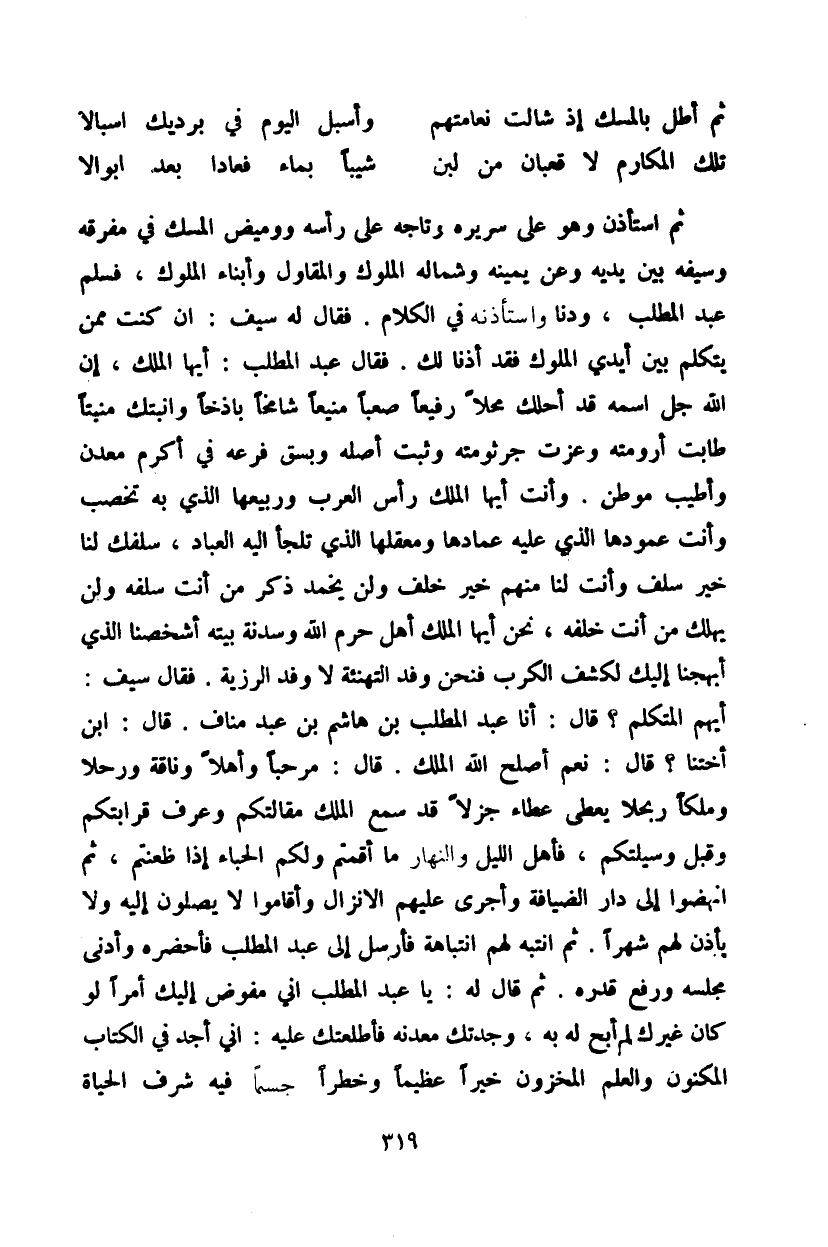 ثم استأذن وهو على سريره وتاجه على رأسه ووميض المسك في مفرقه وسيفه بين يديه وعن يمينه وشماله الملوك والمقاول وأبناء الملوك، فسلم عبد المطلب، ودنا وأستأذنه في الكلام. فقال له سيف: إن كنت ممن يتكلم بين أيدي الملوك فقد أذنا لك. فقال عبد المطلب: أيها الملك، إن الله جل اسمه قد أحلك محلاً رفيعاً
