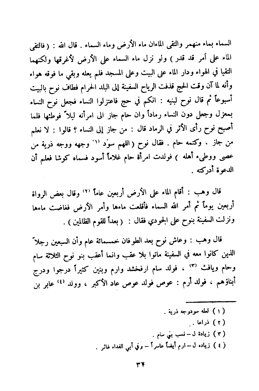 والتقى الماءان ماء الأرض وماء السماء. قال الله: {فالتقى الماء على أمر قد قدر} ولو نزل الله ماء السماء على الأرض لأغرقها ولكنهما التقيا في الهواء ودار الماء على البيت وعلى المسجد فلم يعد وبقي ما فوقه هواء وأنه لما آن وقت الحج قذفت الرياح السفينة إلى البلد الحرام فطاف نوح بالبيت أسبوعاً ثم قال نوح لبنيه: إنكم في حج فاعتزلوا النساء فجعل نوح النساء بمعزل وجعل دون النساء رماداً وإن حام جاز إلى امرأته ليلاً فوطئها فلما أصبح نوح رأى الأثر في الرماد قال: من جاز إلى النساء؟ قالوا: لا نعلم من جاز. وكتمه حام. فقال نوح (اللهم سود وجهه ووجه ذرية من عصى ووطئ أهله) فولدت امرأة حام غلاماً أسود فسماه كوشا فعلم أن الدعوة أدركته.