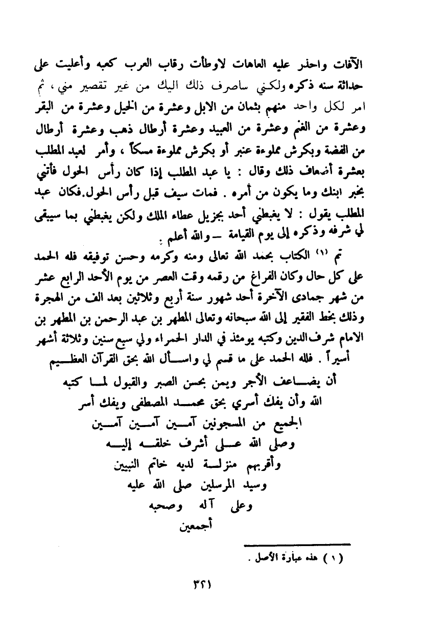 سبحانه وعالي المطهر بن عبد الرحمن بن المطهر بن الإمام شرف الدين وكتبه يومئذ في الدار الحمراء ولي سبع سنين وثلاثة أشهر أسيراً. فلله الحمد على ما قسم لي واسأل الله بحق القرآن العظيم أن يضاعف الأجر ويمن بحسن الصبر والقبول لما كتبه الله وإن يفك أسري بحق محمد المصطفى ويفك أسر الجميع من المسجونين آمين آمين آمين وصلى الله على أشرف خلقه إليه وأقربهم منزلة لديه خاتم النبيين وسيد المرسلين صلى الله عليه وعلى آله وصحبه أجمعين.