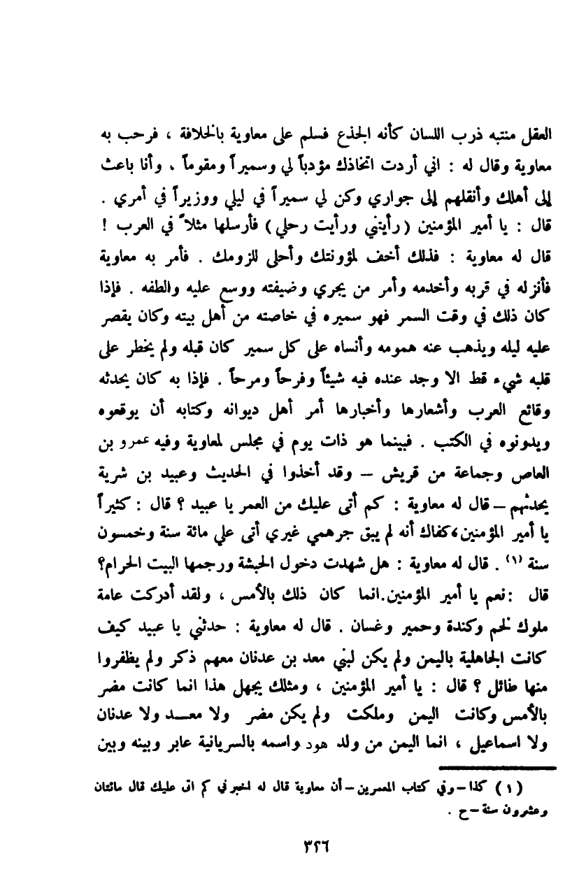 العقل منتبه ذرب اللسان كأنه الجذع فسلم على معاوية بالخلافة، فرحب به معاوية وقال له: أني أردت اتخاذك مؤدباً لي وسميراً ومقوماً، وانا باعث إلى أهلك وأنقلهم إلى جواري وكن لي سميراً في ليلي ووزيراً في أمري. قال: يا أمير المؤمنين (رأيتني ورأيت رحلي) فأرسلها مثلاً في العرب، قال له معاوية: فذلك أخف لمئونتك وأحلى للزومك. فأمر به معاوية فأنزله في قربه وأخدمه وأمر من يجري وضيفته ووسع عليه وألطفه. فإذا كان ذلك في وقت السمر فهو سميره في خاصته من أهل بيته وكان يقصر عليه ليله ويذهب عنه همومه وأنساه على كل سمير كان قبله ولم