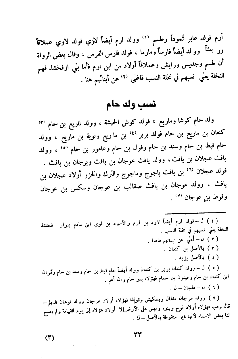 أرم فولد عابر ثموداً وطسم وولد آرم أيضاً لاوي فولد لاوي عملاقاً وريثاً وولد أيضاً فارساً ومارما، فولد فارس الفرس. وقال بعض الرواة أن طسم وجديش ورايش وعملاقاً أولاد من ابن ارم فأما بني ازفخشد فهم النخلة يعني نسبهم في نخلة النسب فاغنى عن أبنائهم هنا.