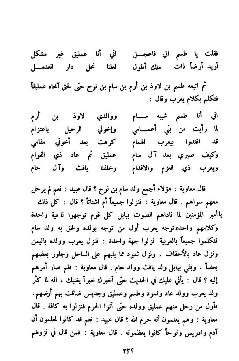 قال معاوية: هؤلاء أجمع ولد سام بن نوح؟ قال عبيد: نعم لم يرحل معهم سواهم. قال معاوية: فنزلوا جميعاً أم شتاتاً؟ قال: كل ذلك يا أمير المؤمنين لما ناداهم الصوت ببابل كل قوم توجهوا ناحية واحدة وكلامهم واحد، توجه يعرب أول من توجه بولده ولحق به ولد سام فتكلموا جميعاً بالعربية نزلوا جهة واحدة: فنزل يعرب وولده باليمن ونزل عاد بالأحقاف، ونزل ثمود مما يليهم على الساحل وجاور بعضهم بعضاً، وبقي ببابل ولد يافث وولد حام. قال معاوية: فلم صار أمرهم إليه؟ قال: يأتي عليك في الحديث حتى أخبرك خبراً يغنيك، إنه لما كثر ولد يعرب وولد عاد وثمود وطسم وعمليق وجديس ضاقت بهم أرضهم، فأول من رحل منهم عمليق وولده حتى أتوا الحرم فنزلوا به كافة. قال معاوية: وهم يعلمون إنه حرم الله؟ قال عبيد: نعم قد كانوا لمعلمون أن آدم وإدريس ونوحاً كانوا يعظمونه. قال عاوية: فمن قال في نزولهم