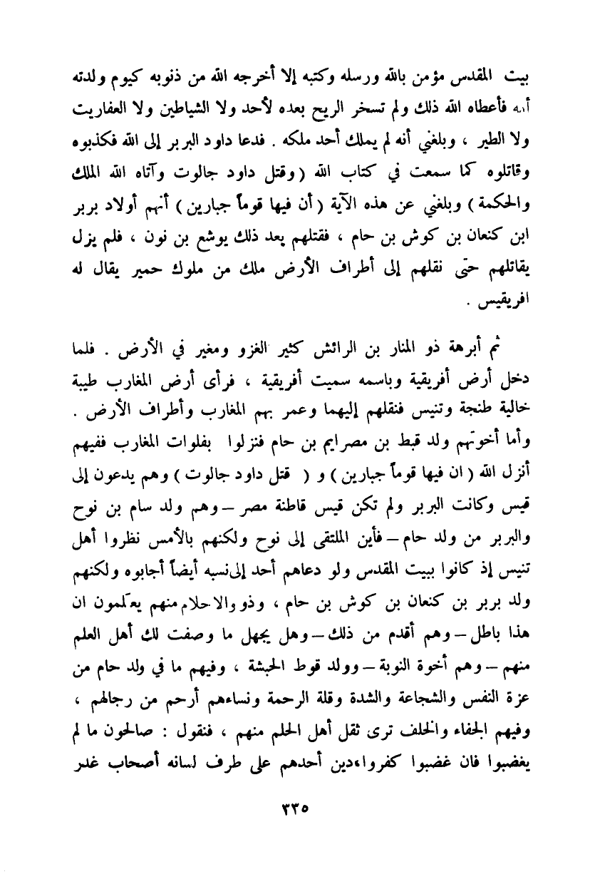 ثم ابرهة ذو المنار بن الرائش كثير الغزو ومغير في الأرض. فلما دخل أرض أفريقية وباسمه سميت أفريقية، فرأى أرض المغارب يبة خالية طنجة وتنيس فنقلهم إليهما وعمر بهم المغارب وأطراف الأرض. وأما أخوتهم ولد قبط بن مصرايم بن حام فنزلوا بفلوات المغارب ففيهم أنزل الله {إن فيها قوماً جبارين} و {قتل داود جالوت} وهم يدعون إلى قيس وكانت البربر ولم تكن قيس قاطنة مصر - وهم ولد سام بن نوح والبربر من ولد حام - فأين الملتقى إلى نوح ولكنهم بالأمس نظروا أهل تنيس إذ كانوا ببيت المقدس ولو دعاهم أحد إلى نسبه أيضاً أجابوه ولكنهم ولد بربر بن كنعان بن كوش بن حام، وذو والأحلام منهم يعلمون أن هذا باطل - وهم أقدم من ذلك - وهل يجهل ما وصفت لك أهل العلم منهم - وهم أخوة النوبة - وولد قوط الحبشة، وفيهم ما في ولد حام من عزة النفس والشجاعة والشدة وقلة الرحمة ونساءهم أرحم من رجالهم، وفيهم الجفاء والخلف نرى ثقل أهل الحلم منهم، فنقول: صالحون ما لم يغضبون فإن غضبوا كفروا، دين أحدهم على طرف لسانه أصحاب غدر