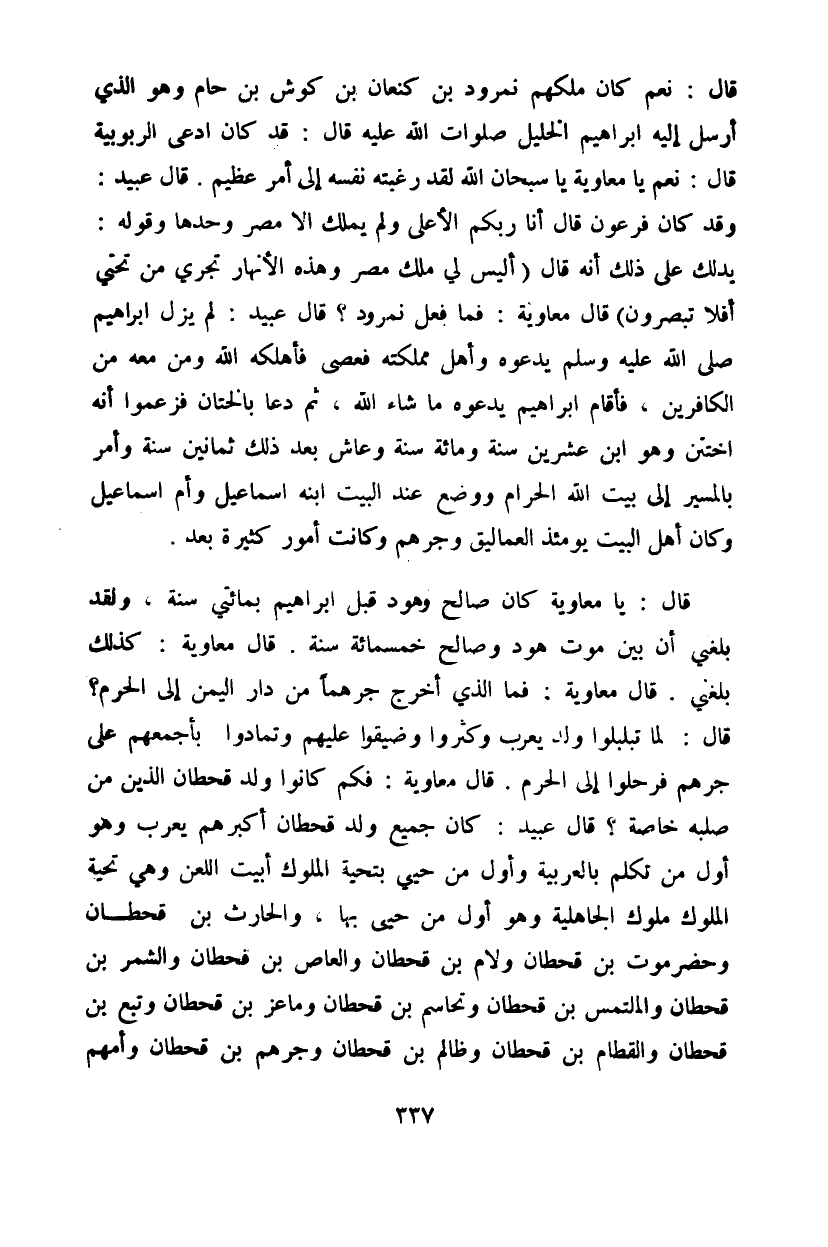 قال: يا معاوية كان صالح وهود قبل إبراهيم بمائتي سنة، ولقد بلغني أن بين موت هود وصالح خمسمائة سنة. قال معاوية: كذلك بلغني. قال معاوية: فما الذي أخرج جرهماً من دار اليمن إلى الحرم؟ قال: لما تبلبلوا ولد يعرب وكثروا وضيقوا عليهم وتمادوا بأجمعهم على جرهم فرحلوا إلى الحرم. قال معاوية: فكم كانوا ولد قحطان الذين من صلبه خاصة؟ قال عبيد: كان جميع ولد قحطان أكبرهم يعرب وهو أول من تكلم بالعربية وأول من حيي بتحية الملوك أبيت اللعن وهي تحية الملوك ملوك الجاهلية وهو أول من حيي بها، والحارث بن قحطان وحضر موت بن قحطان ولام بن قحطان والعاص بن قحطان والشمر بن قحطان والملتمس بن قحطان وتحاسم بن قحطان وماعز بن قحطان وتبع بن قحطان والقطام بن قحطان وظالم بن قحطان وجرهم بن قحطان وامهم