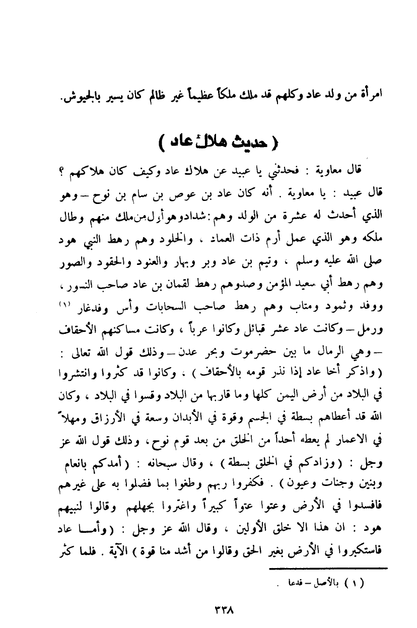 قال معاوية: فحدثني يا عبيد عن هلاك عاد وكيف كان هلاكهم؟ قال عبيد: يا معاوية. إنه كان عاد بن عوص بن سام بن نوح - وهو الذي أحدث له عشرة من الولد وهم: شداد وهو أول من ملك منهم وطال ملكه وهو الذي عمل أرم ذات العماد، والخلود وهم رهط النبي هود صلى الله عليه وسلم، وتيم بن عاد وبر وبهار والعنود والحقود والصور وهم رهط أبي سعيد المؤمن وصدوهم رهط لقمان بن عاد صاحب النسور، ووفد وثمود ومتاب وهم رهط صاحب السحابات وأس وفد غار ورمل - وكانت عاد عشر قبائل وكانوا عرباً، وكانت مساكنهم الأحقاف - وهي الرمال ما بين حضر موت وبحر عدن - وذلك قول الله تعالى: {واذكر أخا عاد إذ أنذر قومه بالأحقاف}، وكانوا قد كثروا وانتشروا في البلاد من ارض اليمن كلها وما قاربها من البلاد وقسوا في البلاد، وكان الله قد أعطاهم بسطة في الجسم وقوة في الأبدان وسعة في الأرزاق ومهلاً في الأعمار لم يعطه أحداً من الخلق من بعد قوم نوح، وذلك قول الله عز وجل: {وزادكم في الخلق بسطة}، وقال سبحانه: {أمدكم بأنعام وبنين وجنات وعيون}. فكفروا ربهم وطغوا بما فضل به على غيرهم فافسدوا في الأرض وعتوا عتواً كبيراً واغتروا بجهلهم وقالوا لنبيهم هود: أن هذا إلا خلق الأولين ظن وقال الله عز وجل: {وأما عاد فاستكبروا في الأرض بغير الحق وقالوا من أشد منا قوة} الآية. فلما كثر