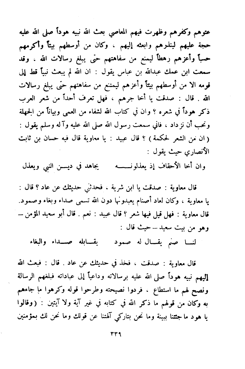 عتوهم وكفرهم وظهرت فيهم المعاصي بعث الله نبيه هودا صلى الله عليه حجة عليهم لينذرهم وابعثه إليهم، وكان من أوسطهم بيتاً وأكرمهم حسباً وأعزهم رهطاً ليمنع من سفاهتهم حتى يبلغ رسالات الله، وقد سمعت ابن عمك عبد الله بن عباس يقول: إن الله لم يبعث نبياً قط إلى قومه إلا من أوسطهم بيتاً وأعزهم ليمتنع من سفاهتهم حتى يبلغ رسالات الله. قال: صدقت يا أخا جرهم، فهل تعرف أحداً من شعر العرب ذكر هوداً في شعره؟ وإن في كتاب الله لشفاء من العمى وبياناً من الجهلة ونحب أن نزداد، فأني سمعت رسول الله صلى الله عليه وآله وسلم يقول: {إن من الشعر لحكمة}؟ قال عبيد: يا معاوية قال فيه حسان بن ثابت الأنصاري حيث يقول: