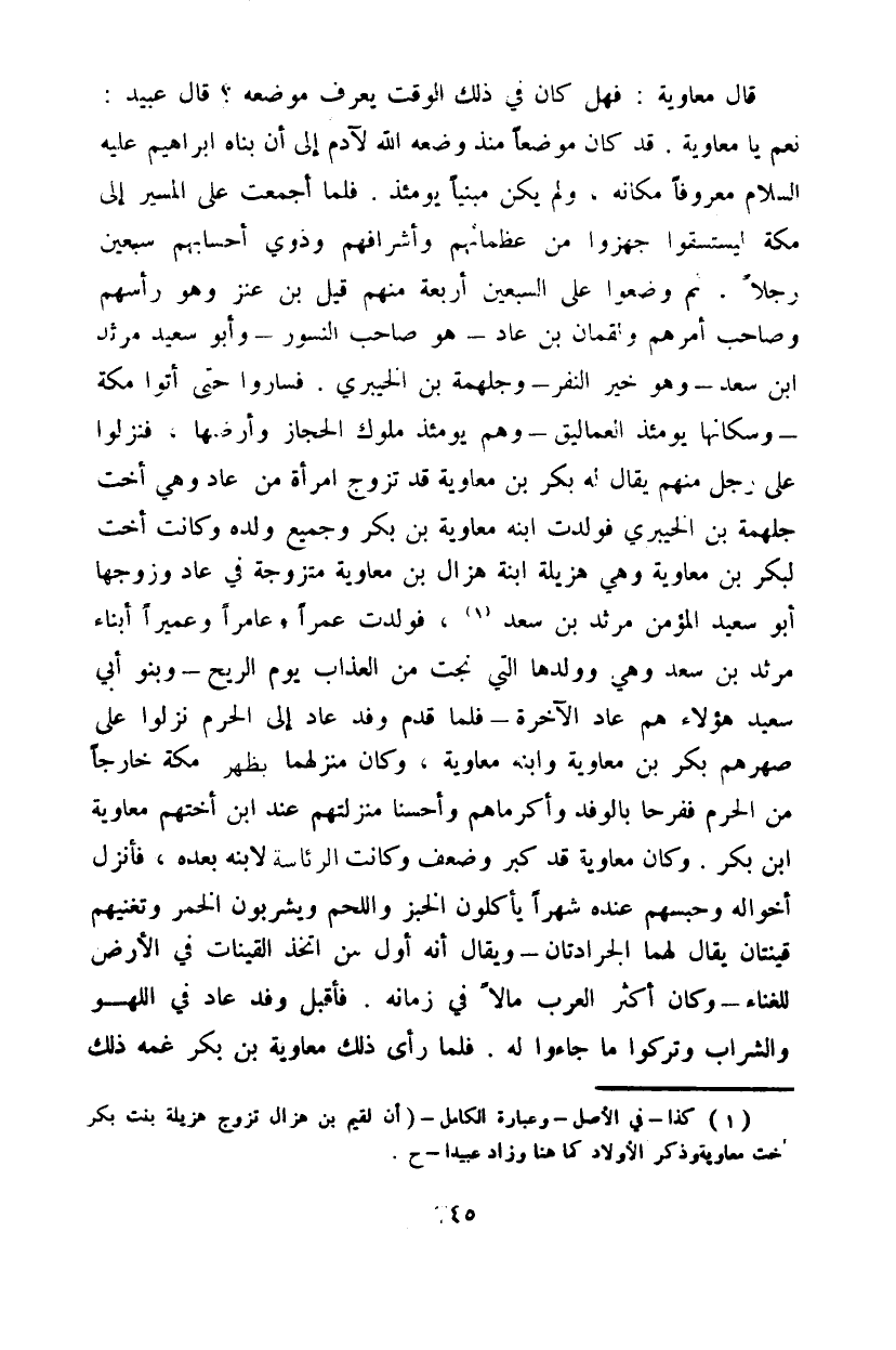 قال معاوية: فهل كان في ذلك الوقت يعرف موضعه؟ قال عبيد: نعم يا معاوية. قد كان موضعاً منذ وضعه الله لآدم إلى أن بناه إبراهيم عليه السلام معروفاً مكانه، ولم مبيناً يومئذ. فلما أجمعت على المسير إلى مكة ليستسقوا جهزوا من عظمائهم وأشرافهم وذوي أحسابهم سبعين رجلاً. ثم وضعوا على السبعين أربعة منهم قيل بن عنز وهو رأسهم وصاحب أمرهم ولقمان بن عاد - هو صاحب النسور - وأبو سعيد مرثد ابن سعد - وهو خير النفر - وجلهمة بن الخيبري. فساروا حتى أتوا مكة - وسكانها يومئذ العماليق - وهم يومئذ ملوك الحجاز وأرضها، فنزلوا على رجل منهم يقال له بكر بن معاوية بن بكر وجميع ولده