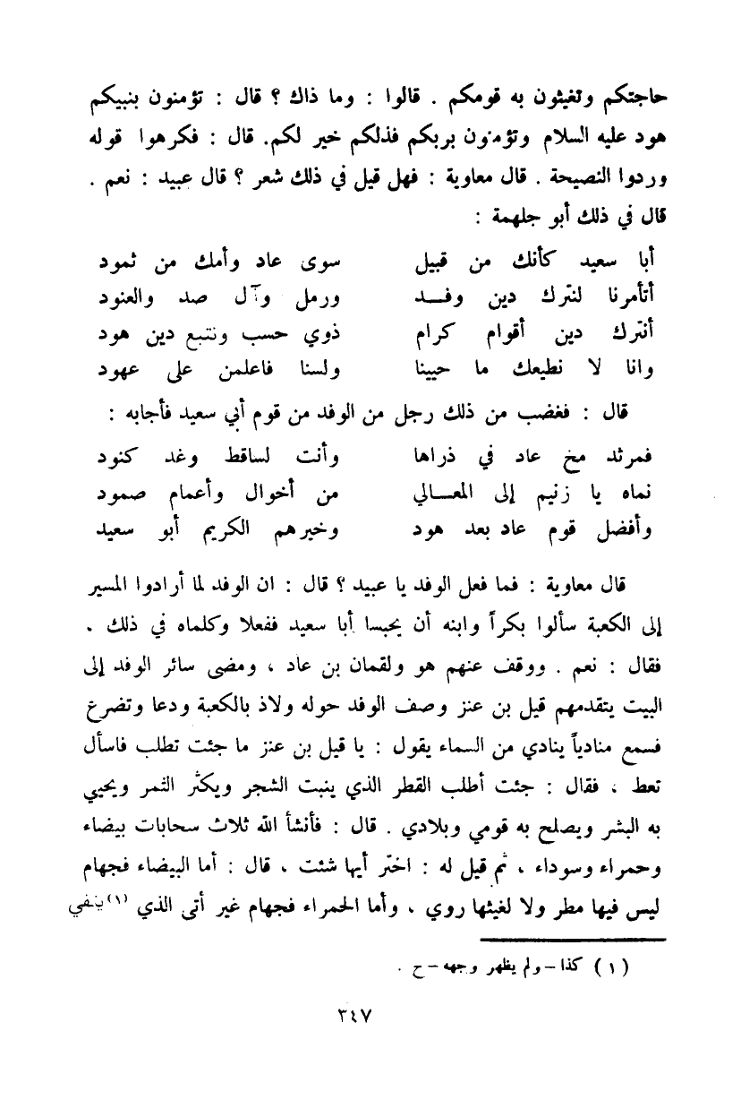 حاجتكم وتغيثون به قومكم. قالوا: وما ذاك؟ قال: تؤمنون بنبيكم هود عليه السلام تؤمنون بربكم فذلكم خير لكم. قال: فكرهوا قوله وردوا النصيحة. قال معاوية: فهل قيل في ذلك شعر؟ قال عبيد: نعم. قال في ذلك أبو جلهمة:
