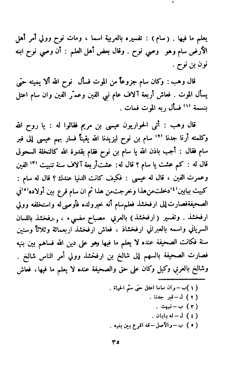 قال وهب: أتى الحواريون عيسى بن مريم فقالوا له: يا روح الله وكلمته أرنا جدنا سام بن نوح ليزيدنا الله يقيناً فسار بهم عيسى إلى قبر سام فقال: أجب بإذن الله يا سام بن نوح فقام بقدرة الله كالنخلة السحوق قال له: كم عشت يا سام؟ قال له عشت أربعة آلاف سنة تنبيت ألفين وعمرت ألفين، قال له عيسى: فكيف كانت الدنيا هناك؟ قال له سام: كبيت ببابين دخلت من هذا وخرجت من هذا ثم أن ساع قرع بين أولاده في الصحيفة فصارت إلى ارفخشد فعلم سام إنه خير ولده فأوصى له واستخلفه وولي ارفخشد. وتفسير (ارفخشد) بالعربي مصباح مضيء، وارفخشد باللسان السرياني واسمه بالعبراني ارفخشاد، فعاش ارفخشد أربعمائة وثلاثاً وستين سنة فكانت الصحيفة عنده لا يعلم ما فيها وهو على دين الله فساهم بين بنيه فصارت الصحيفة بالسهم إلى شالخ بن ارفخشد وولي أمر الناس شالخ. وشالخ بالعربي وكيل وكان على حق والصحيفة لا يعلم ما فيها، فعاش