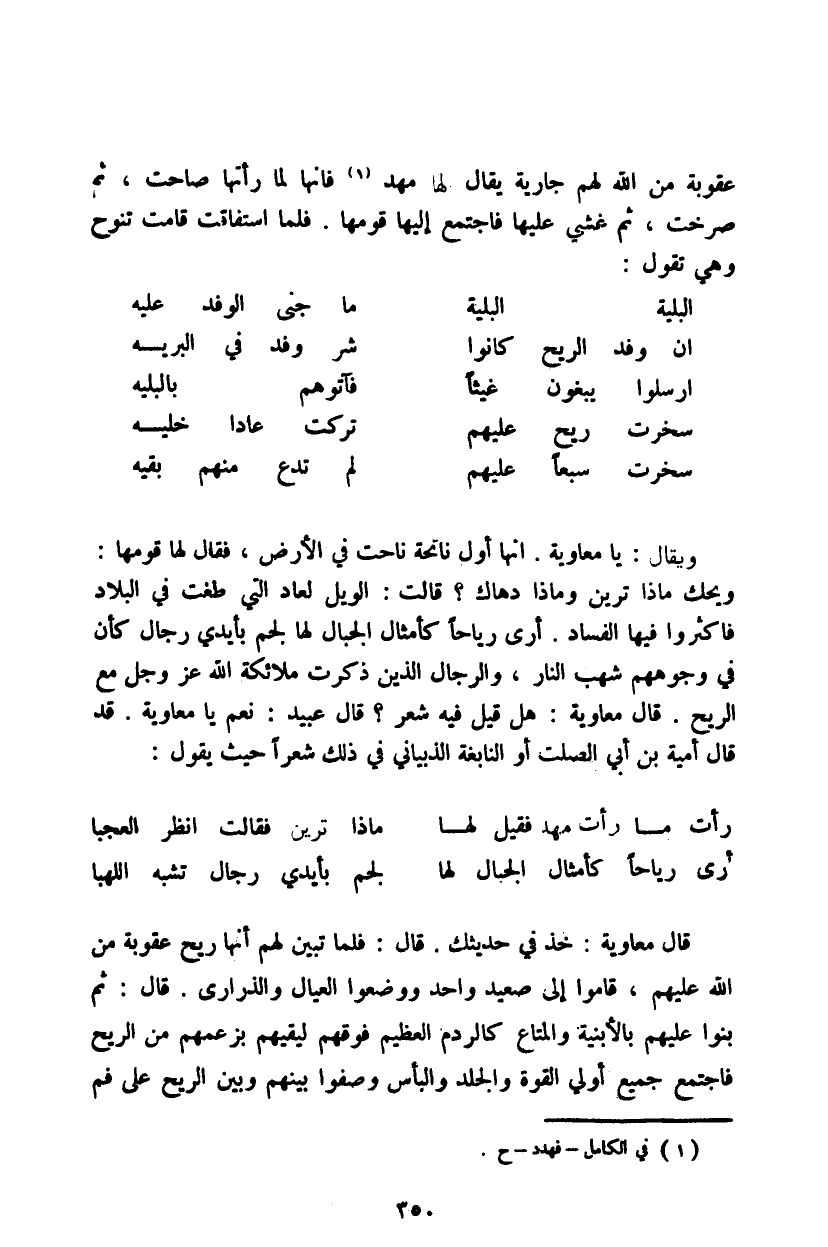 ويقال: يا معاوية. أنها أول نائحة ناحت في الأرض، فقال لها قومها: ويحك ماذا ترين وماذا دهاك؟ قالت: الويل لعاد التي طغت في البلاد فأكثروا فيها الفساد. أي رياحاً كأمثال الجبال لها لجم بأيدي رجال كأن في وجوههم شهب النار، والرجال الذين ذكرت ملائكة الله عز وجل مع الريح. قال معاوية: هل قيل فيه شعر؟ قال عبيد: نعم يا معاوية. قد قال أمية بن أبي الصلت أو النابغة الذبياني في ذلك شعراً حيث يقول: