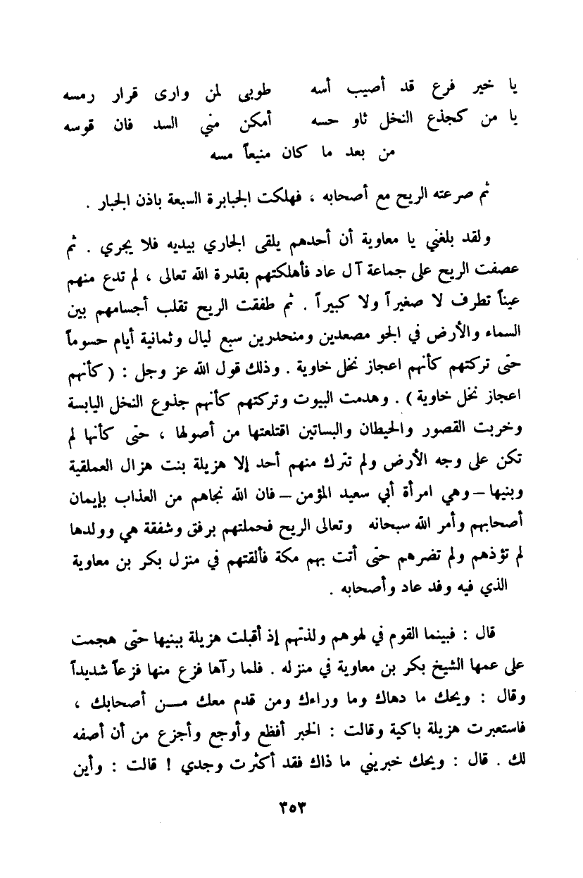 ولقد بلغني يا معاوية أن أحدهم يلقى الجاري بيديه فلا يجري. ثم عصفت الريح على جماعة آل عاد فأهلكتهم بقدرة الله تعالى، لم تدع منهم عيناً تطرف لا صغيراً ولا كبيراً. ثم طفقت الريح تقلب أجسامهم بين السماء والأرض في الجو مصعدين ومنحدرين سبع ليال وثمانية أيام حسوماً حتى تركتهم كأنهم أعجاز نخل خاوية. وذلك قول الله عز وجل: {كأنهم أعجاز نخل خاوية}. وهدمت البيوت وتركتهم كأنهم جذوع النخل اليابسة وخربت القصور والحيطان والبساتين أقلعتها من