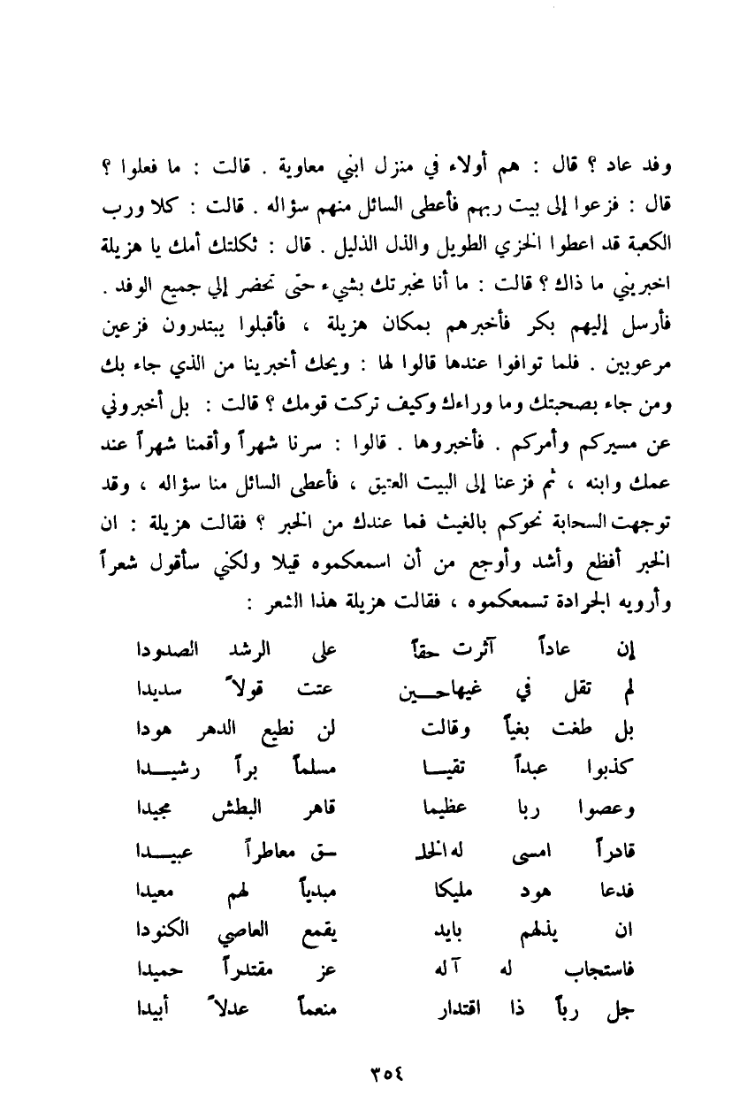 وفد عاد؟ قال: هم أولاء في منزل ابني معاوية. قالت: ما فعلا؟ قال: فزعوا إلى بيت ربهم فأعطى السائل منهم سؤاله. قالت: كلا ورب الكعبة قد أعطوا الخزي الطويل والذل الذليل. قال: ثكلتك أمك يا هزيلة اخبريني ما ذاك؟ قالت: ما أنا مخبرتك بشيء حتى تحضر إلي جميع الوفد. فأرسل إليهم بكر فأخبرهم بمكان هزيلة، فأقبلوا يبتدرون فزعين مرعوبين. فلما توافوا عندها قالوا لها: ويحك أخبرينا من الذي جاء بك ومن جاء بصحبتك وما وراءك وكيف تركت قومك؟ قالت: بل أخبروني عن مسيركم وأمركم. فأخروها. قالوا: سرنا شهراً وأقمنا شهراً عند عمك وابنه، ثم فزعنا إلى البيت العتيق، فأعطى السائل منا سؤاله، وقد توجهت السحابة نحوكم بالغيث فما عندك من الخبر؟ فقالت هزيلة: إن الخبر أفظع وأشد وأوجع من أن اسمعكموه قيلا ولكني سأقول شعراً وأرويه الجرادة تسمعكموه، فقالت هزيلة هذا الشعر: