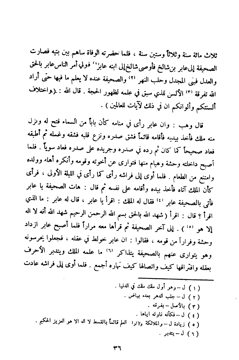 ثلاث مائة سنة وثلاثاً وستين سنة، فلما حضرته الوفاة ساهم بين بنيه فصارت الصحيفة إلى عابر بن شالخ فأوصى شالخ إلى ابنه عابر فولي أمر الناس عابر بالحق والعدل فبنى المجدل وحلب النهر والصحيفة عنده لا يعلم ما فيها حتى أراد الله تفرقة الألسن للذي سبق في علمه لظهور الحجة. قال الله {واختلاف ألسنتكم وألوانكم إن في ذلك لآيات للعالمين}.