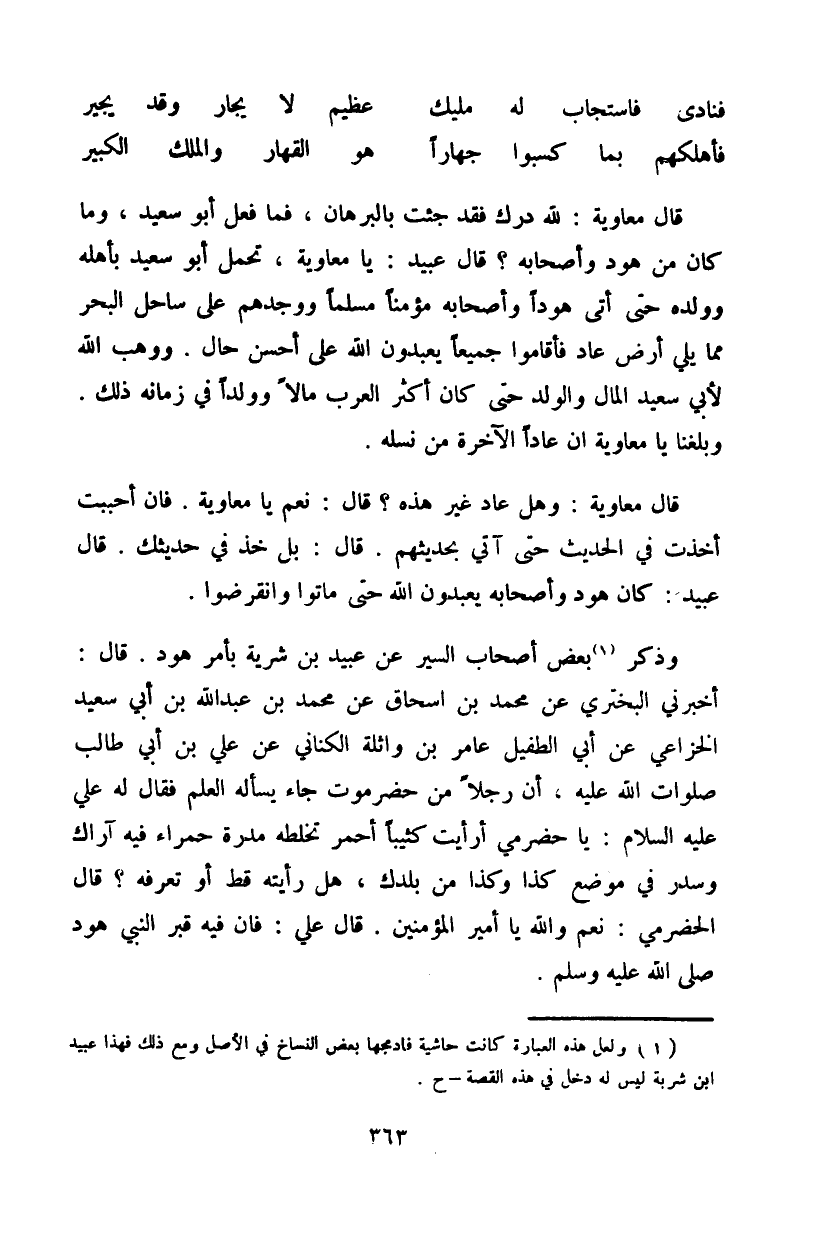 قال معاوية: وهل عاد غير هذه؟ قال: نعم يا معاوية. فإن أحببت أخذت في الحديث حتى آتي بحديثهم. قال: بل خذ في حديثك. قال عبيد: كان هود وأصحابه يعبدون الله حتى ماتوا وانقرضوا.