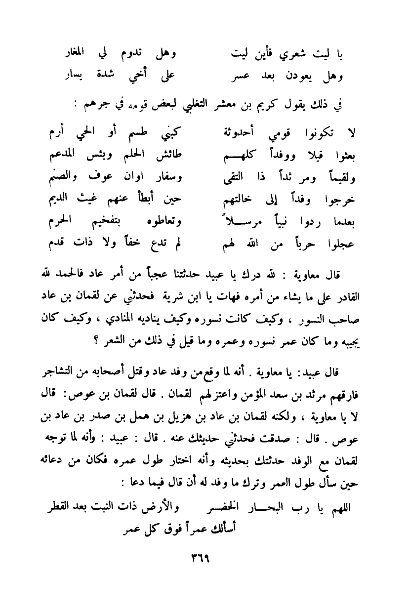 قال معاوية: لله درك يا عبيد حدثتنا عجباً من أمر عاد فالحمد لله القادر على ما يشاء من أمره فهات يا ابن شرية فحدثني عن لقمان بن عاد صاحب النسور، وكيف كانت نسوره وكيف يناديه المنادي، وكيف كان يجيبه وما كان عمر نسوره وعمره وما قيل في ذلك من الشعر؟ قال عبيد: يا معاوية. إنه لما وقع من وفد عاد وقتل أصحابه من التشاجر فارقهم مرثد بن سعد المؤمن واعتزلهم لقمان. قال لقمان بن عوص: قال لا يا معاوية، ولكنه لقمان بن عاد بن هزيل بن همل بن صدر بن عاد بن عوص. قال: صدقت فحدثني حديثك عنه. قال: عبيد: وأنه لما
