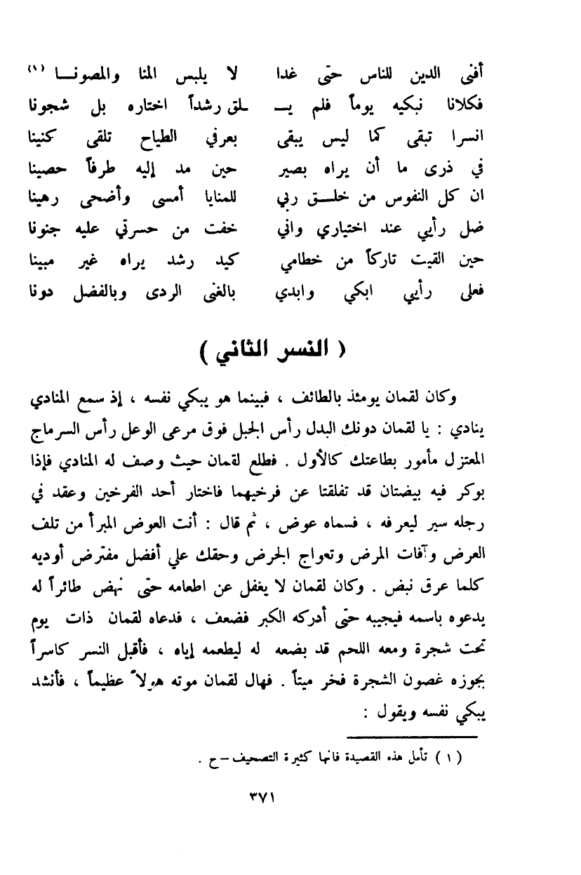 وكان لقمان يومئذ بالطائف، فبينما هو يبكي نفسه، إذ سمع المنادي ينادي: يا لقمان دونك البدل رأس الجبل فوق مرعى الوعل رأس السرماج المعتزل مأمور بطاعتك كالأول. فطلع لقمان حيث وصف له المنادي فإذا بوكر سير ليعرفه، فسماه عوض، ثم قال: أنت العوض المبرأ من تلف العرض وآفات المرض وعواج الجرض وحقك علي أفضل مفترض أوديه كلما عرق نبض. وكان لقمان لا يغفل عن إطعامه حتى نهض طائراً له يدعوه باسمه فيجيبه حتى أدركه الكبر فضعف، فدعاه لقمان ذات يوم تحت شجرة ومعه اللحم قد بضعه له ليطعمه إياه، فأقبل النسر كاسراً بجوزه غصون الشجرة فخر ميتاً. فهال لقمان موته هولاً عظيماً، فأنشد يبكي نفسه ويقول: