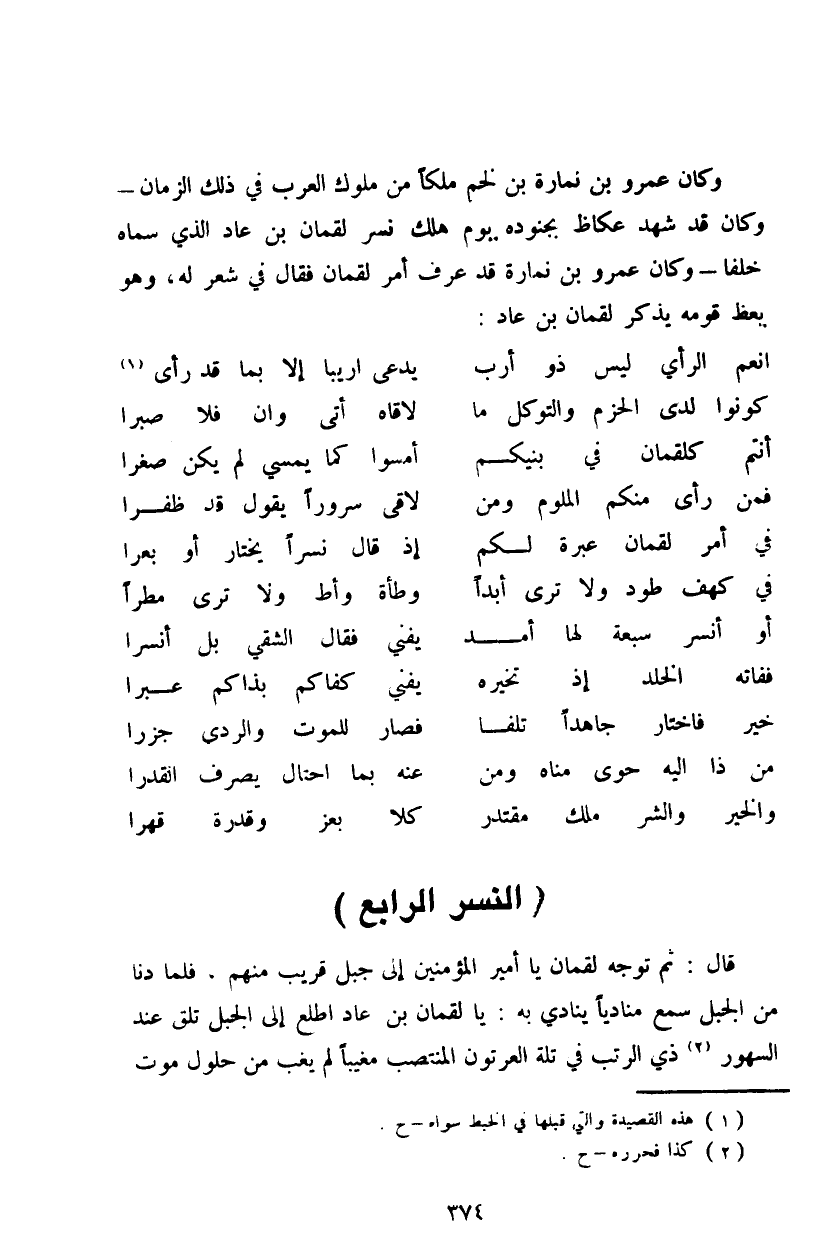 قال: ثم توجه لقمان يا أمير المؤمنين إلى جبل قريب منهم، فلما دنا من الجبل سمع منادياً ينادي به: يا لفمان بن عاد اطلع إلى الجبل تلق عند السهور ذي الرتب في تلة العرتون المنتصب مغيباً لم يغب من حلول موت