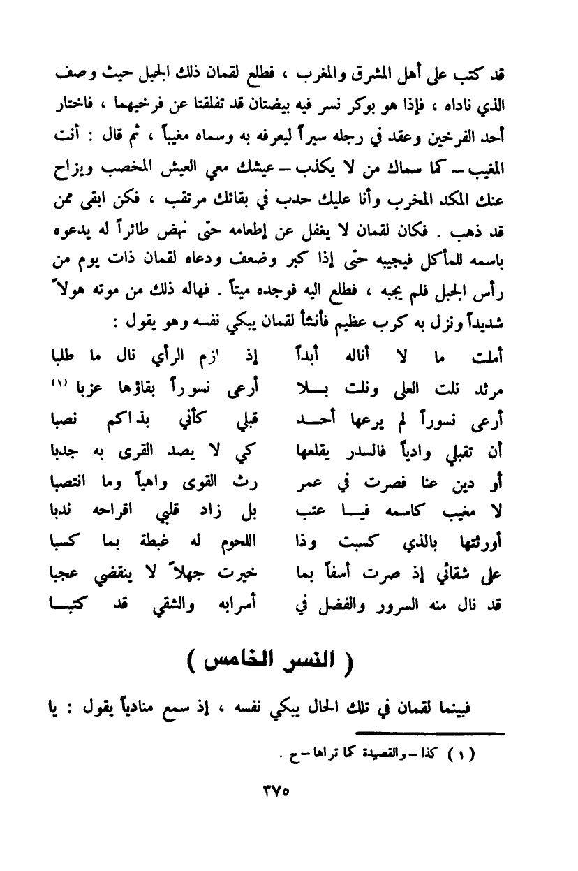 قد كتب على أهل المشرق والمغرب، فطلع لقمان ذلك الجبل حيث وصف الذي ناداه، فإذا هو بوكر نسر فيه بيضتان قد تفلقتا عن فرخيهما، فاختار أحد الفرخين وعقد في رجله سيراً ليعرفه به وسماه مغيباً، ثم قال: أنت المغيب - كما سماك من لا يكذب - عيشك معي العيش المخصب ويزاح عنك المكد المخرب وأنا عليك حدب في بقائك مرتقب، فكن أبقى ممن قد ذهب. فكان لقمان لا يغفل عن إطعامه حتى نهض طائراً له يدعوه باسمه للمأكل فيجيبه حتى إذا كبر وضعف ودعاه لقمان ذات يوم من رأس الجبل فلم يجبه، فطلع إليه فوجده ميتاً. هاله ذلك من موته هولاً شديداً ونزل به كرب عظيم فأنشأ لقمان يبكي نفسه وهو يقول: