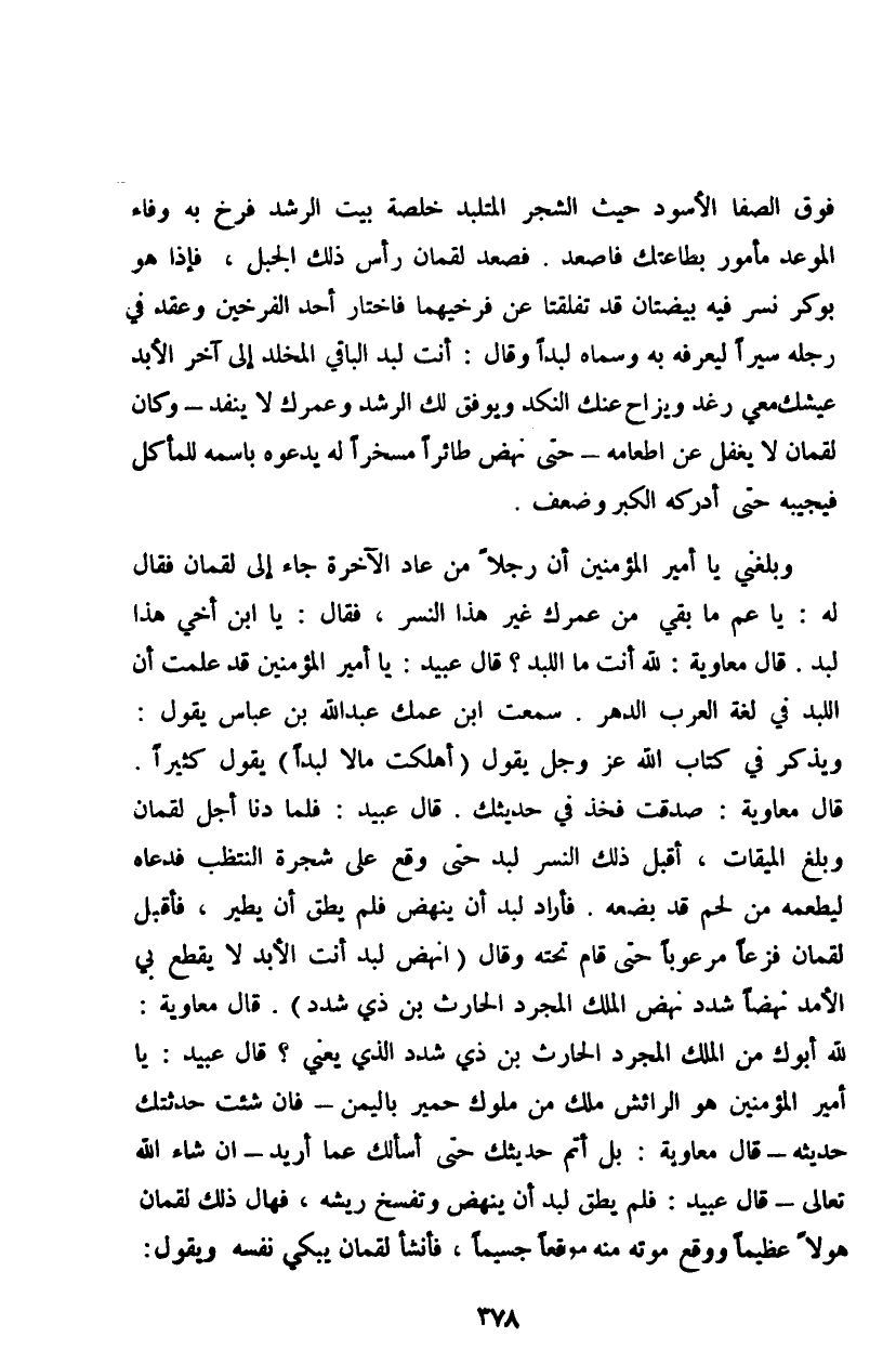 وبلغني يا أمير المؤمنين أن رجلاً من عاد الآخرة جاء إلى لقمان فقال له: يا عم ما بقي من عمرك غير هذا النسر، فقال: يا ابن أخي هذا لبد. قال معاوية: لله أنت ما اللبد؟ قال عبيد: يا أمير المؤمنين قد علمت أن اللبد في لغة العرب الدهر. سمعت ابن عمك عبد الله بن عباس يقول: ويذكر في كتاب الله عز وجل يقول {أهلكت مالا لبداً} يقول كثيراً. قال معاوية: صدقت فخذ في حديثك. قال عبيد: فلما دنا أجل لقمان وبلغ الميقات، أقبل ذلك النسر لبد حتى وقع على شجرة النتظب فدعاه ليطعمه من لحم قد بضعه. فأراد لبد أن ينهض فلم يطق أن يطير، فأقبل لقمان فزعاً مرعوباً حتى قام حتى وقال (انهض لبد أنت الأبد لا يقطع بي الأمد نهضاً شدد نهض الملك المجرد الحارث بن ذي شدد). قال معاوية: لله أبوك من الملك المجرد الإرث بن ذي شدد الذي يعني؟ قال عبيد: يا أمير المؤمنين هو الرائش ملك من ملوك حمير باليمن - فإن شئت حدثتك حديثه - قال معاوية: بن