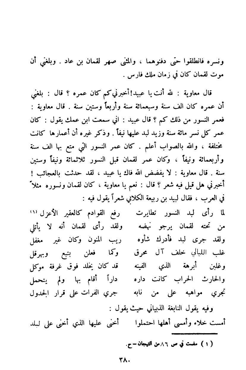قال معاوية: لله أنت يا عبيد! أخبرني كم كان عمره؟ قال: بلغني أن عمره كان ألف سنة وسبعمائة سنة وأربعاً وستين سنة. قال معاوية: فعمر النسور من ذلك كم؟ قال عبيد: إني سمعت ابن عمك يقول: كان عمر كل نسر مائة سنة وزيد لبد عليها نيفاً. وذكر غيره أن أعمارها كانت مختلفة، والله بالصواب أعلم. كان عمر النسور التي متع بها ألف سنة وأربعمائة ونيفاً، وكان عمر لقمان قبل النسور ثلاثمائة ونيفاً وستين سنة. قال معاوية: لا يفضض الله فاك يا عبيد، لقد حدثت بالعجائب! أخبرني هل قيل فيه شعر؟ قال: نعم يا معاوية، كان لقمان ونسوره مثلاً في العرب، فقال لبيد بن ربيعة الكلابي شعراً يقول فيه: