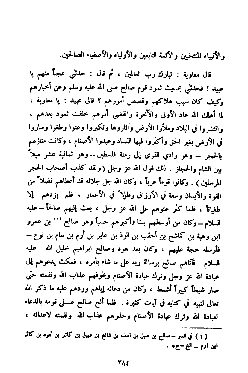 قال معاوية: تبارك رب العالمين، ثم قال: حدثني عجباً منهم يا عبيد! فحدثني بحديث ثمود قوم صالح صلى الله عليه وسلم وعن أخبارهم وكيف كان سبب هلاكهم وقصص أمورهم؟ قال عبيد: يا معاوية، لما اهلك الله عاد الأولى والآخرة وانقضى أمرهم خلفت ثمود بعدهم، وانتشروا في البلاد وملئوا الأرض وأثاروها وتكبروا وعتوا وطغوا وساروا في الأرض بغير الحق وأكثروا فيها الفساد وعبدوا الأصنام، وكانت منازلهم بالحجر - وهو وادي القرى إلى رملة فلسطين - وهو ثمانية عشر ميلاً بين الشام والحجاز. ذلك قول الله عز وجل {ولقد كذب أصحاب الحجر المرسلين}. وكانوا قوماً عرباً، وكان الله جل جلاله قد أعطاهم فضلاً من القوة والأبدان وسعة في الأرزاق وطولاً في الأعمار، فلم يزدهم إلا طغياناً، فلما عتوهم على الله عز وجل، بعث إليهم صالحاً - عليه السلام - وكان من أوسطهم بيتاً وأكبرهم حسباً وهو صالح بن عمرو ابن وهبة بن كماشخ بن أحقب بن الوذ بن عابر بن أرم بن سام بن نوح - فأرسله حجة عليهم، وكان بعد هود وصالح