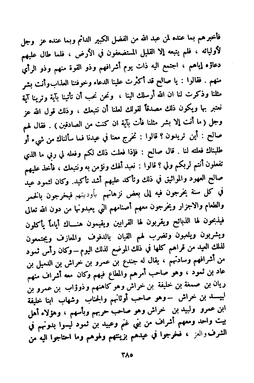 فأخبرهم بما عنده لمن عبد الله من الفضل الكبير الدائم وبما عنده عز وجل لأوليائه، فلم يتبعه إلا القليل المستضعفون في الأرض، فلما طار عليهم دعاؤهم إياهم، اجتمع إليه ذات يوم أشرافهم وذو القوة منهم وذو الرأي منهم. فقالوا: يا صالح قد أكثرت علينا الدعاء وخوفتنا العذاب وأنت بشر مثلنا وذكرت لنا ان الله أرسلك إلينا، ونحن نحب أن تأتينا بآية وترينا آية نعتبر بها ويكون ذلك مصدقا لقولك لعلنا أن نتبعك، وذلك قول الله عز وجل {ما أنت إلا بشر مثلنا فأت بآية إن كنت من الصادقين}. فقال لهم صالح: أين تريدون؟ قالوا: تخرج معنا في عيدنا فما سألناك من شيء أو طلبناك فعلته لنا. قال صالح: فإذا فعلت ذلك لكم وفعله لي ربي ما الذي تفعلون أنتم لربكم ولي؟ قالوا: نعبد ألهك ونؤمن به ونتبعك، فأخذ عليهم صالح العهود والمواثيق في ذلك وتأكد عليهم أشد تأكيد. وكان لثمود عيد من كل سنة يخرجون فيه إلى بعض نزهاتهم بأوديتهم فيخرجون بالخمر والطعام والاجزار ويخرجون معهم أصنامهم التي يعبدونها من دون الله تعالى فيذبحون لها الذبائح ويقربون لها القرابين ويقيمون هناك أياماً يأكلون ويشربون ويلعبون وتضرب لهم القيان بالدفوف والمعازف ويجتمعون لذلك العيد من قراهم كلها في ذلك الموضع لذلك اليوم - وكان رأس ثمود من أشرافهم وسادتهم، يقال له جندع بن عمرو بن خراش بن الدميل بن عاد بن ثمود، وهو صاحب أمرهم والمطاع فيهم وكان معه أشراف منهم ريان بن صمغة بن خليفة بن خراش وهو كاهنهم وذؤاب بن عمرو