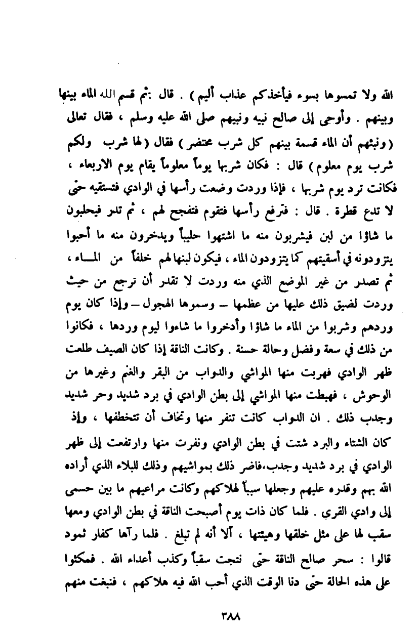 بسوء فيأخذكم عذاب أليم}. قال: ثم قسم الله الماء بينها وبينهم. وأوحى إلى صالح نبيه ونبيهم صلى الله عليه وسلم، فقال تعالى {ونبئهم أن الماء قسمة بينهم كل شرب محتضر} فقال {لها شرب ولكم شرب يوم معلوم} قال: فكان شربها يوماً معلوماً يقام يوم الأربعاء، فكانت ترد يوم شربها، فإذا وردت وضعت رأسها في الوادي فتستقيه حتى لا تدع قطرة. قال: فترفع رأسها فتقوم فتفجح لهم، ثم تدر فيحلبون ما شاءوا من لبن فيشربون منه ما اشتهوا حليباً ويدخرون منه ما أحبوا يتزودونه في أسقيتهم كما يتزودون الماء، فيكون لبنها لهم خلفاً من الماء، ثم تصدر من غير الموضع الذي منه وردت لا تقدر أن ترجع من حيث وردت لضيق ذلك عليها من عظمها - وسموها الهجول - وإذا كان يوم وردهم وشربوا من الماء ما شاءوا وادخروا ما شاءوا ليوم وردها، فكانوا من ذلك في سعة وفضل وحالة حسنة. وكانت الناقة إذا كان الصيف طلعت ظهر الوادي فهربت منها المواشي والدواب من البقر والغنم وغيرها من الوحوش، فهبطت منها المواشي إلى بطن الوادي في برد شديد وحر شديد وجدب ذلك. إن الدواب كانت تنفر منها وتخاف أن تتخطفها، وإذ كان الشتاء والبرد شتت في بطن الوادي ونفرت منها وارتفعت إلى ظهر الوادي في برد شديد وجدب. فاضر ذلك بمواشيهم وذلك للبلاء الذي أراده الله بهم وقدره عليهم وجعلها سبباً لهلاكهم وكانت مراعيهم ما بين حسمى إلى وادي القرى. فلما كان ذات يوم أصبحت الناقة في بطن الوادي ومعها سقب لها على مثل خلقها وهيئتها، إلا إنه لم تبلغ، فلما رآها كفار ثمود قالوا: سحر صالح الناقة حتى نتجت سقباً وكذب أعداء الله. فمكثوا على هذه الحالة حتى دنا الوقت الذي أحب الله فيه هلاكهم، فنبغت منهم