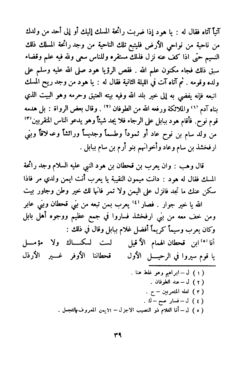 المسلك ذلك النسيم حتى إذا كف عنه فذلك مستقره وللناس سعى ولله فيه علم وقضاء سبق ذلك فجاء مكنون علم الله. فقص الرؤيا هود صلى الله عليه وسلم على ولده وقومه. ثم آتاه آت في الليلة الثانية فقال له: يا هوج من وجد رائحة المسك اتبعه فإنه يفضي به إلى خير بلد الله وفيه بيته العتيق وحرمه وهو البيت الذي بناه آدم والملائكة ورفعه الله من الطوفان. وقال بعض الرواة: بل هدمه ثوم نوح. فأقام هود ببابل على الرجاء فلا يجد شيئاً وهو يدعو الناس المتقربين من ولد سام بن نوح عاد أو ثمود وطسماً وجديساً وراتشاً وعملاقاً وبني ارفخشد بن سام وعاد وإخوانهم بنو أرم بن سام ببابل.